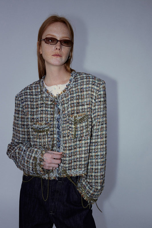 Cropped chain trim rough edge tweed jacket | 2 color