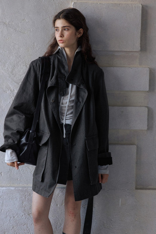 Cotton blend paper-like texture cocoon silhouette trench coat