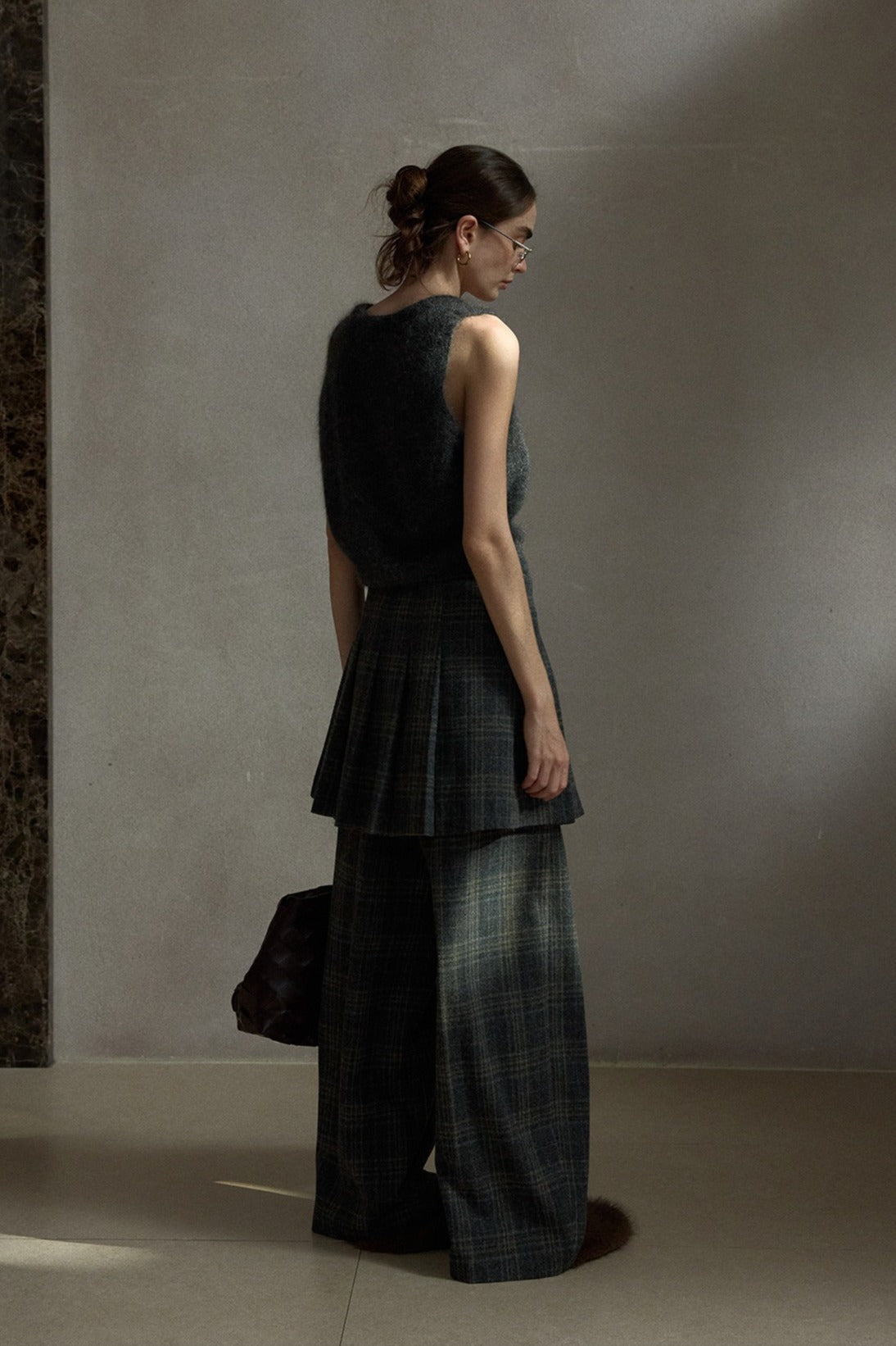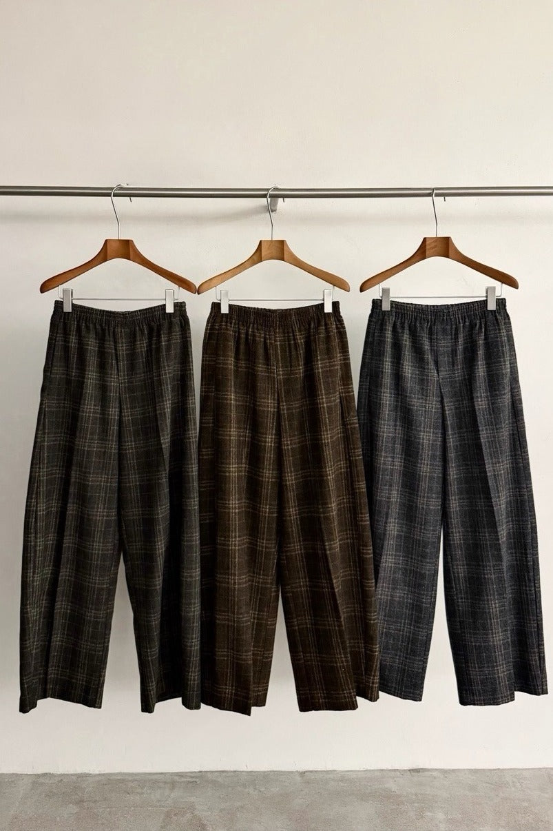 Sharp crease-line down fluid wide-legs, ankle crop. Wool-Poly keeps the drape, color-block checks shout '70s—pair with sneakers for ironic elegance.