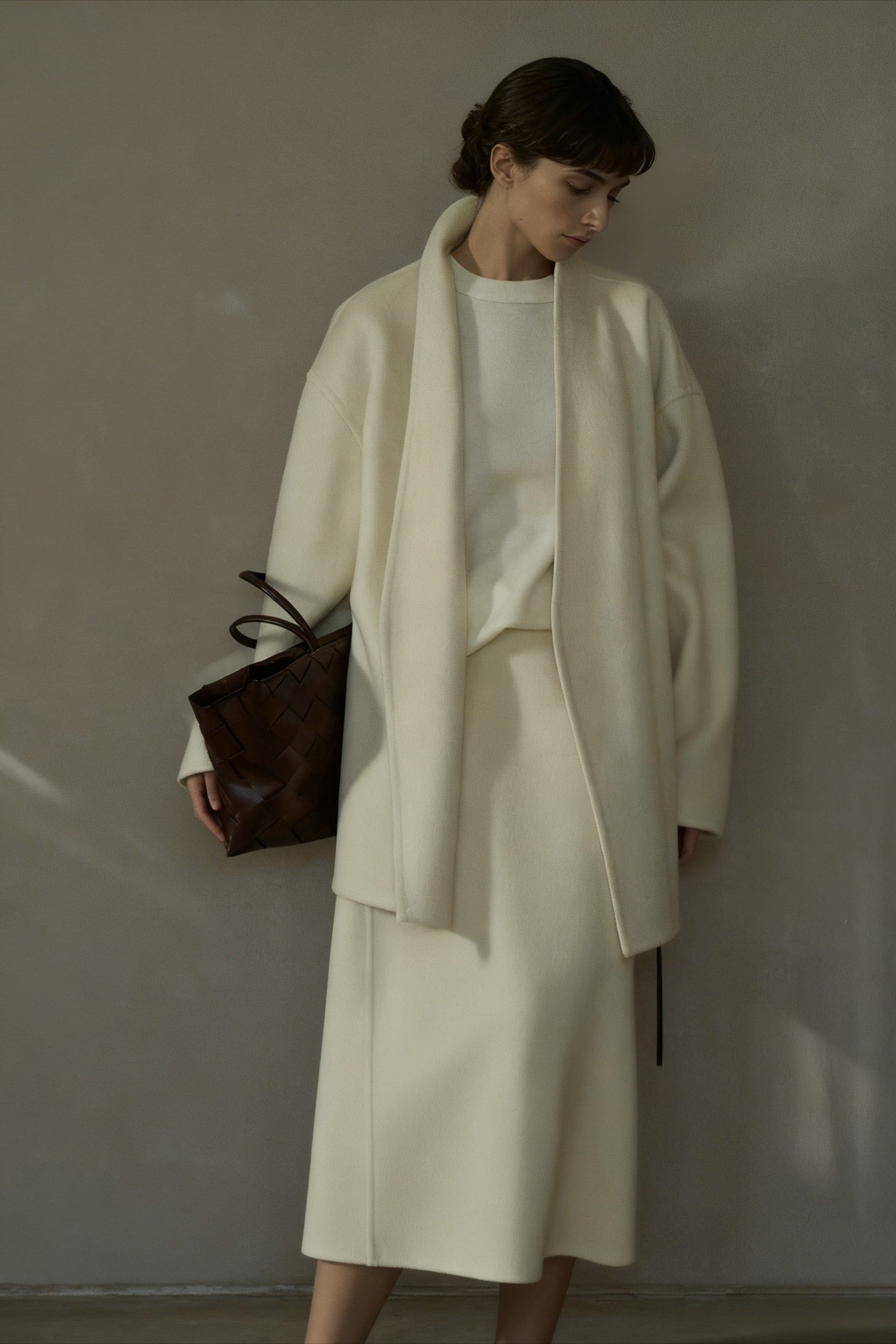 This mid-length double-faced wool-blend coat features a shawl collar and a defined waist with a belt. The classic design and luxurious fabric make it perfect for a sophisticated winter look.