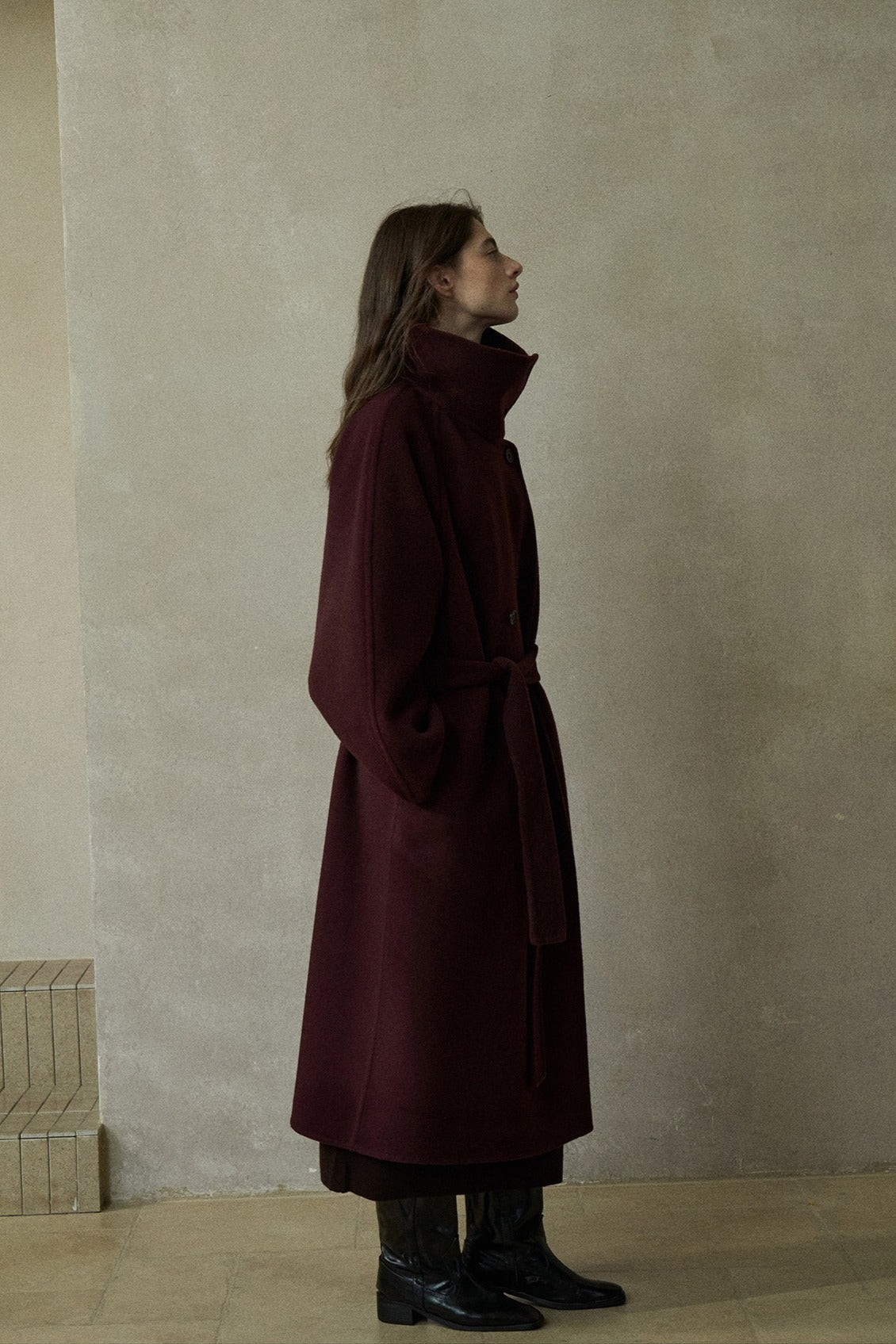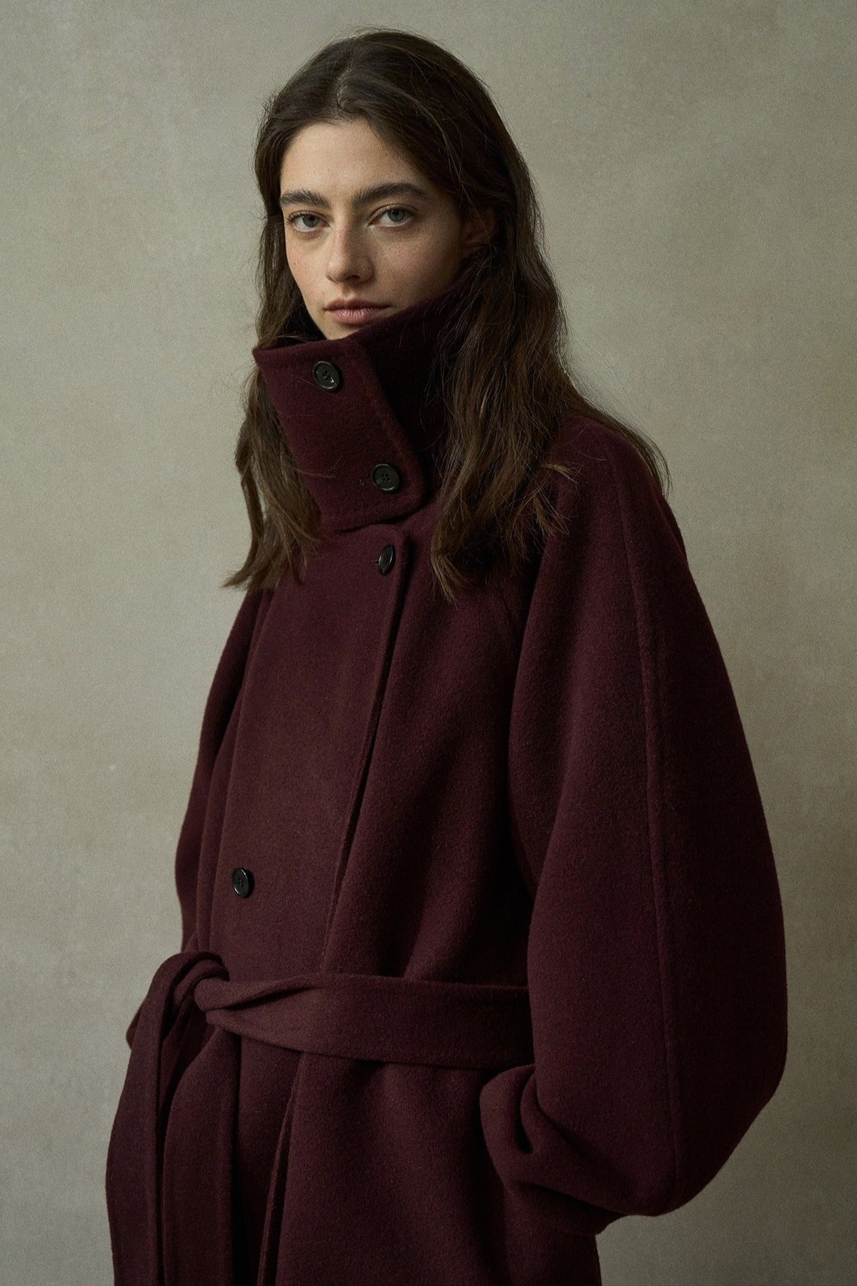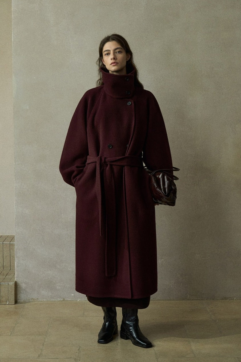 This wool-blend coat features a double row of buttons, a high collar, and side seam process. The smooth fabric and structured design offer a timeless, sophisticated look.