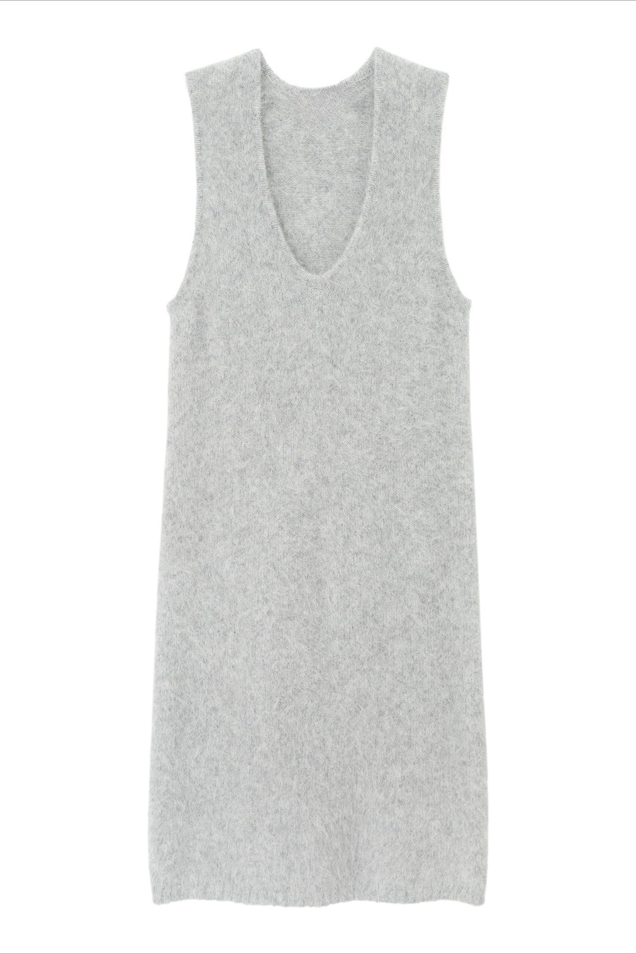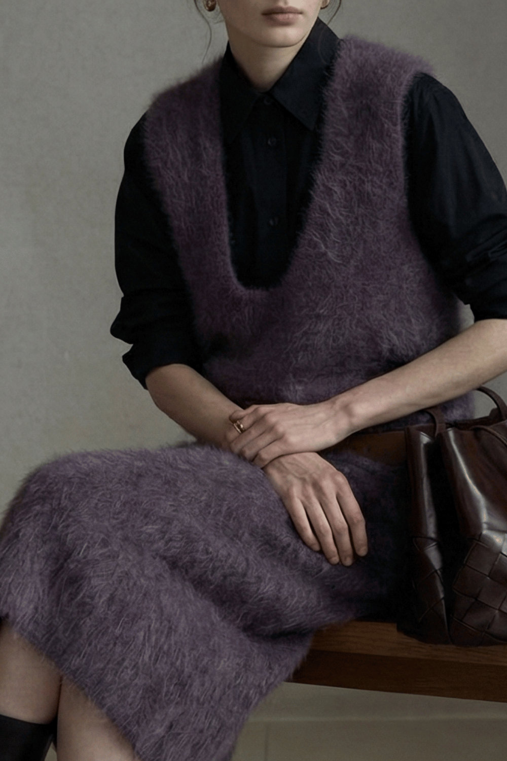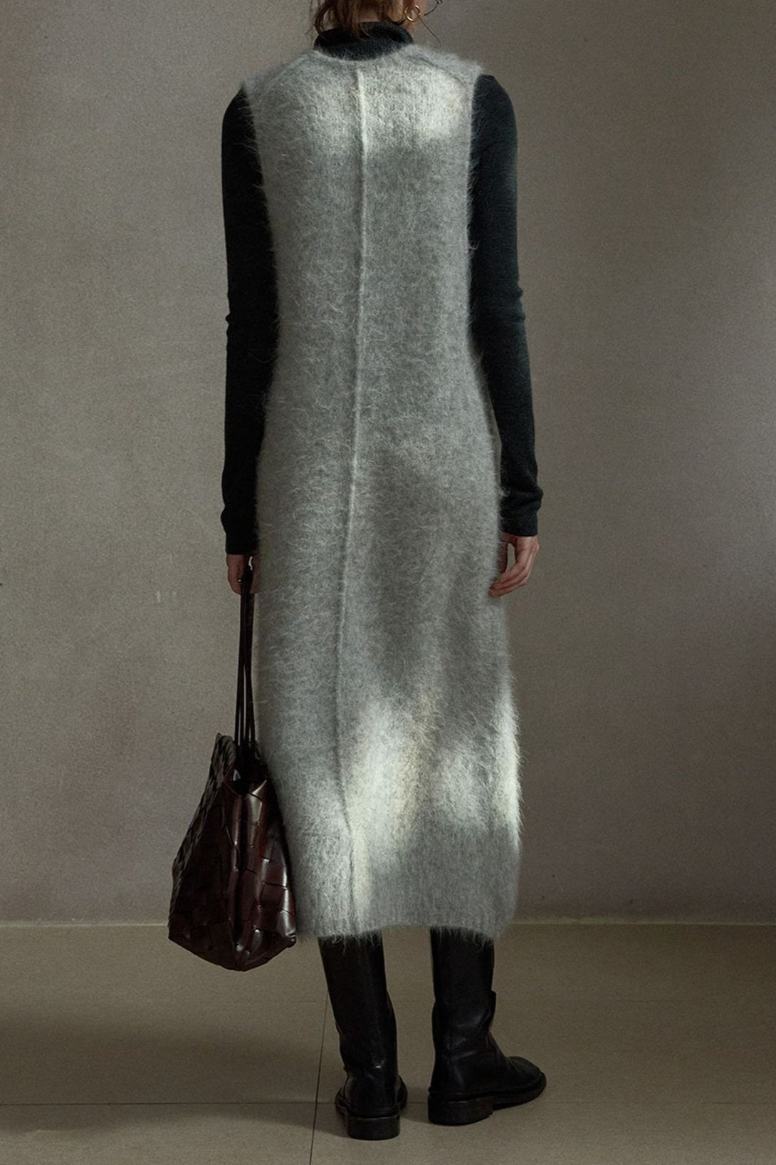 Este vestido de punto de largo medio presenta una textura suave y afelpada, confeccionado con una mezcla de lana de alpaca de primera calidad. Con un clásico escote en V y un diseño sin mangas, ofrece una capa ligera y abrigada, perfecta para crear una silueta invernal elegante y relajada.