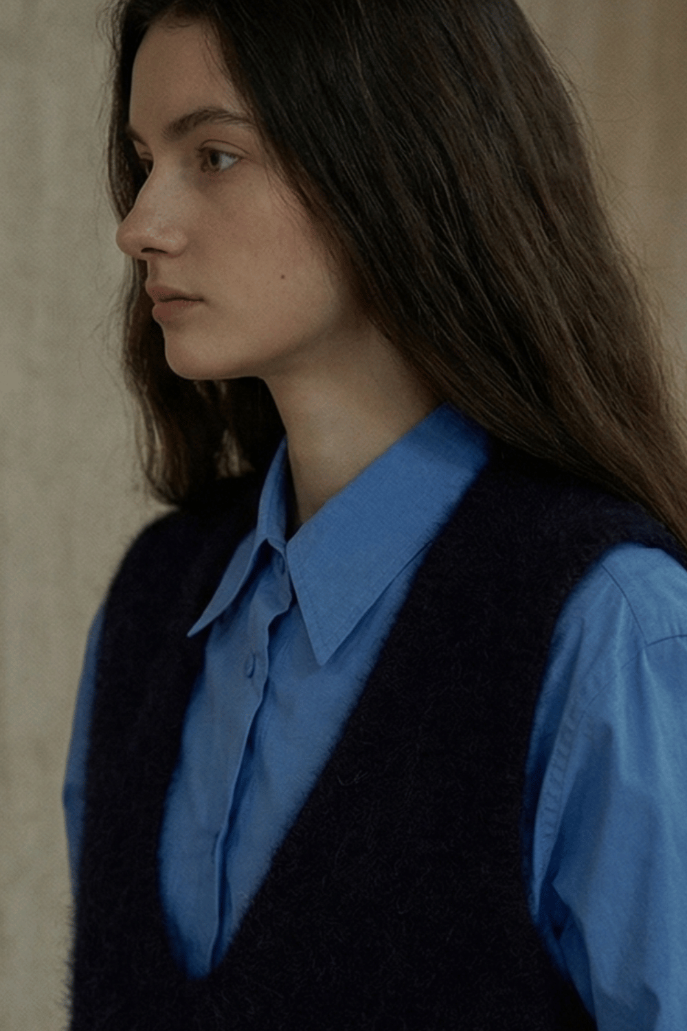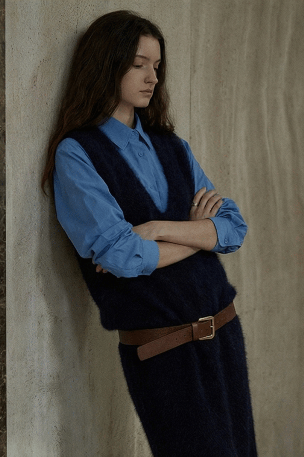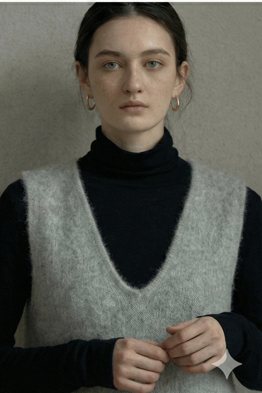 Este vestido de punto de largo medio presenta una textura suave y afelpada, confeccionado con una mezcla de lana de alpaca de primera calidad. Con un clásico escote en V y un diseño sin mangas, ofrece una capa ligera y abrigada, perfecta para crear una silueta invernal elegante y relajada.
