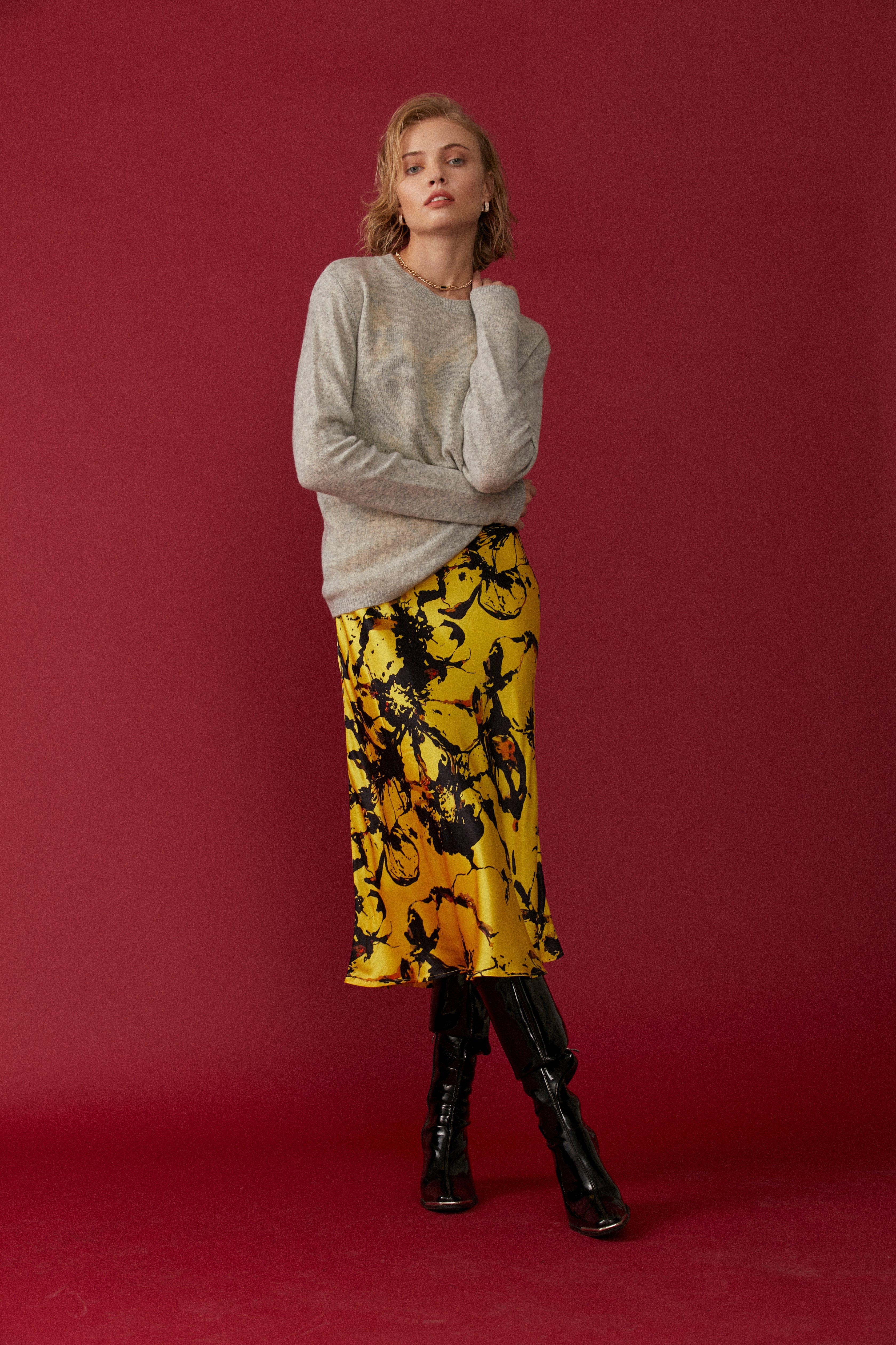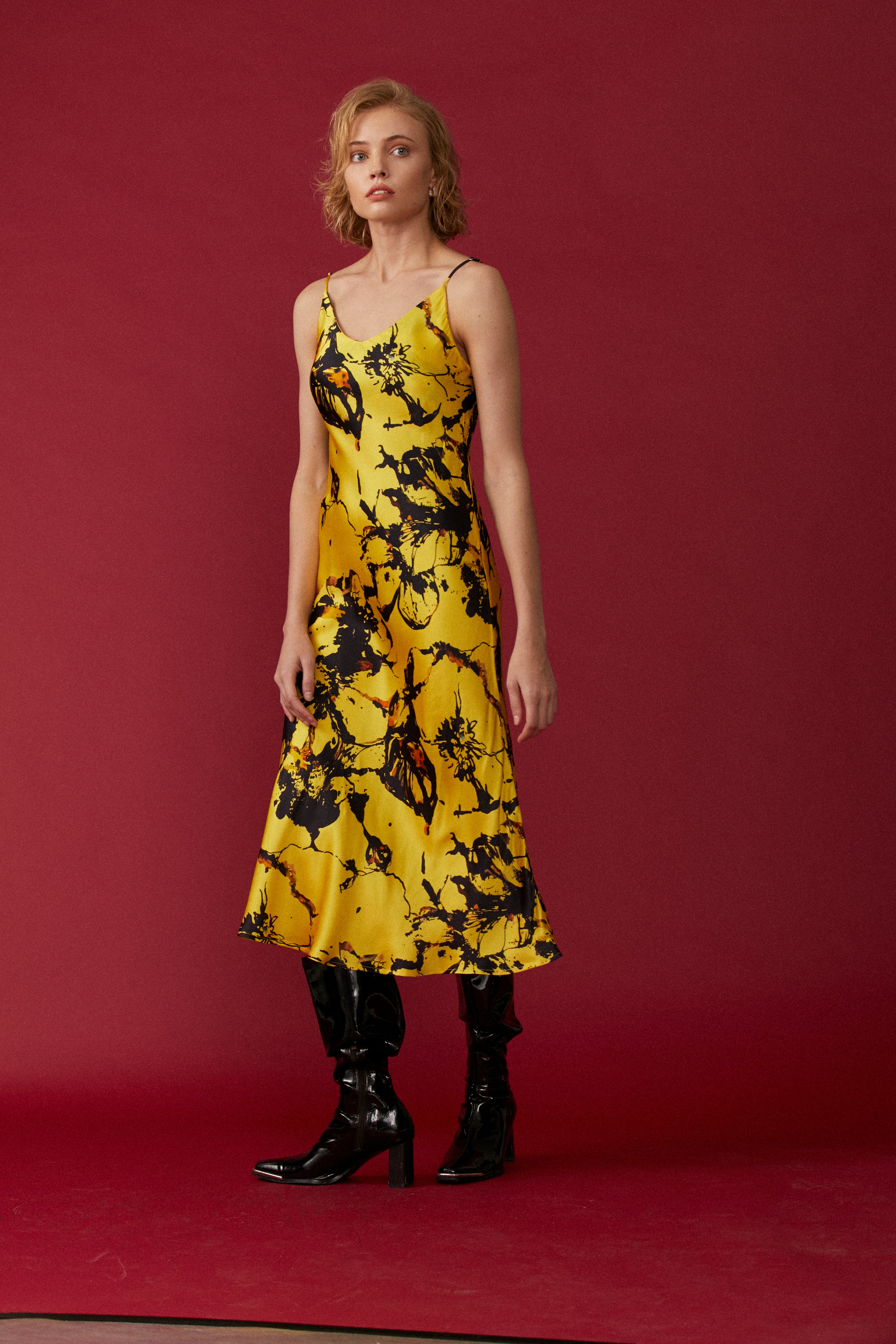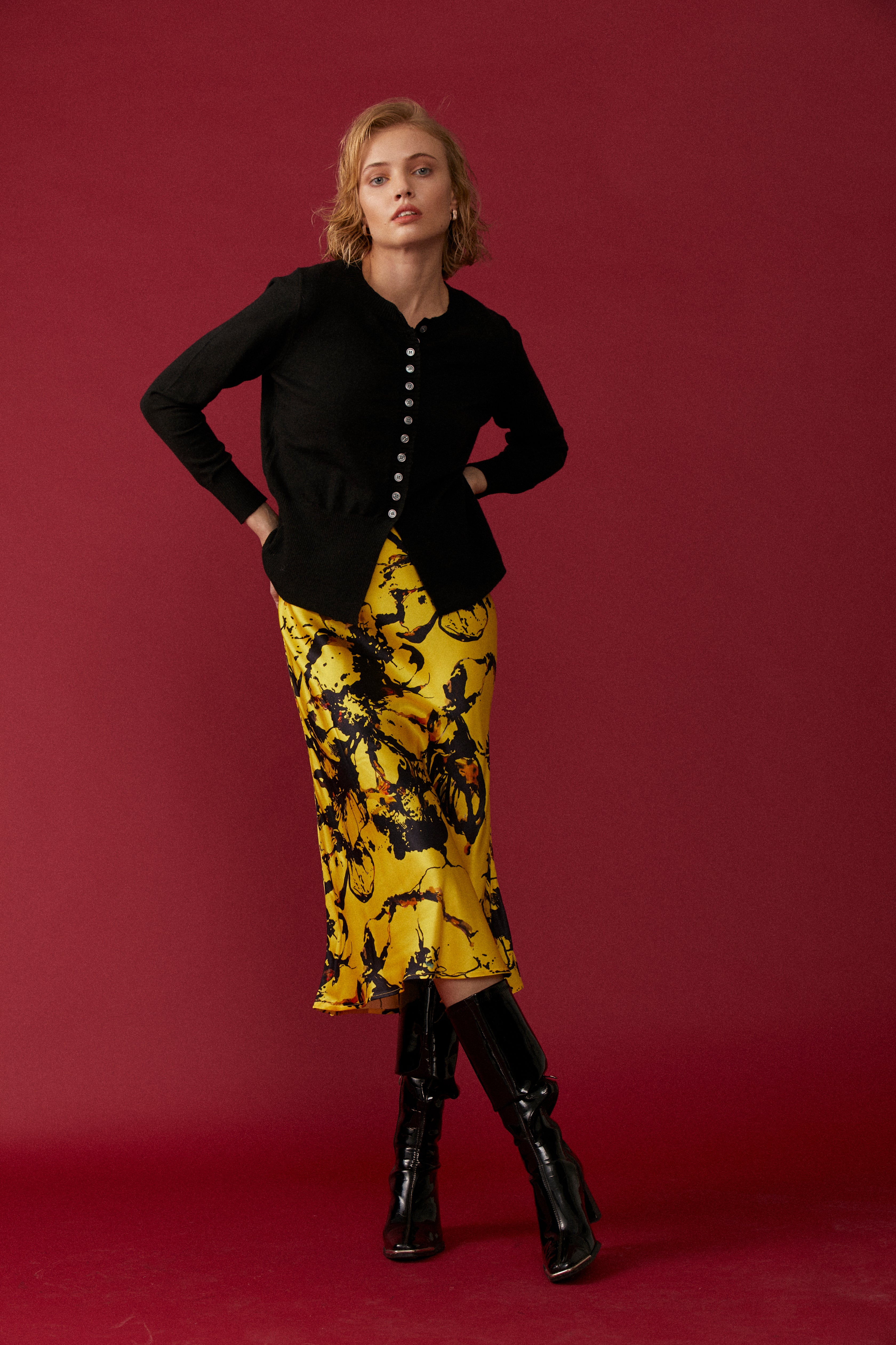 El estilo de pintura a tinta se extiende sobre la tela de rayón de color amarillo néctar, el impacto de color audaz le da un toque de moda decente y vivaz. La forma de corte al bies permite que la falda fluya con la curva del cuerpo.