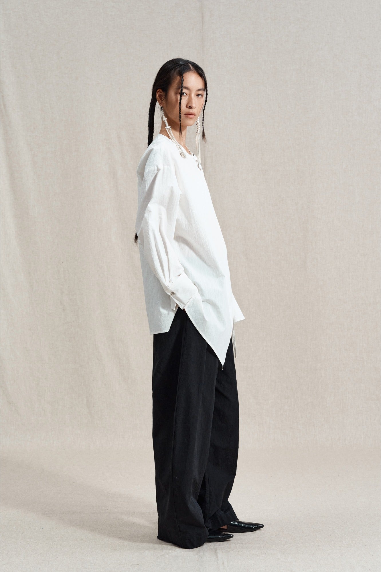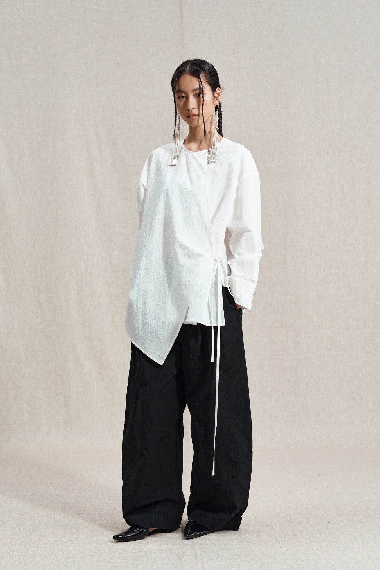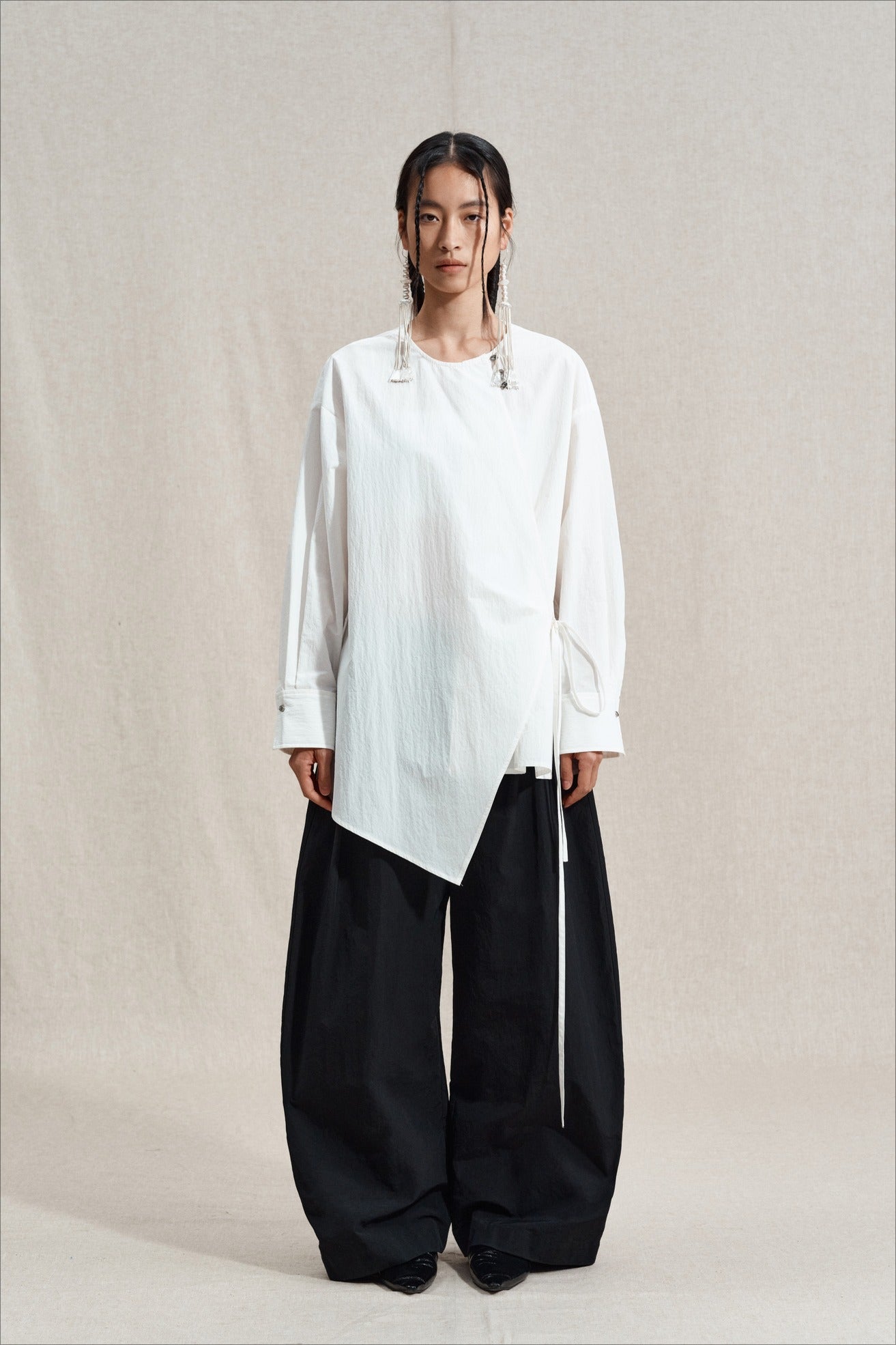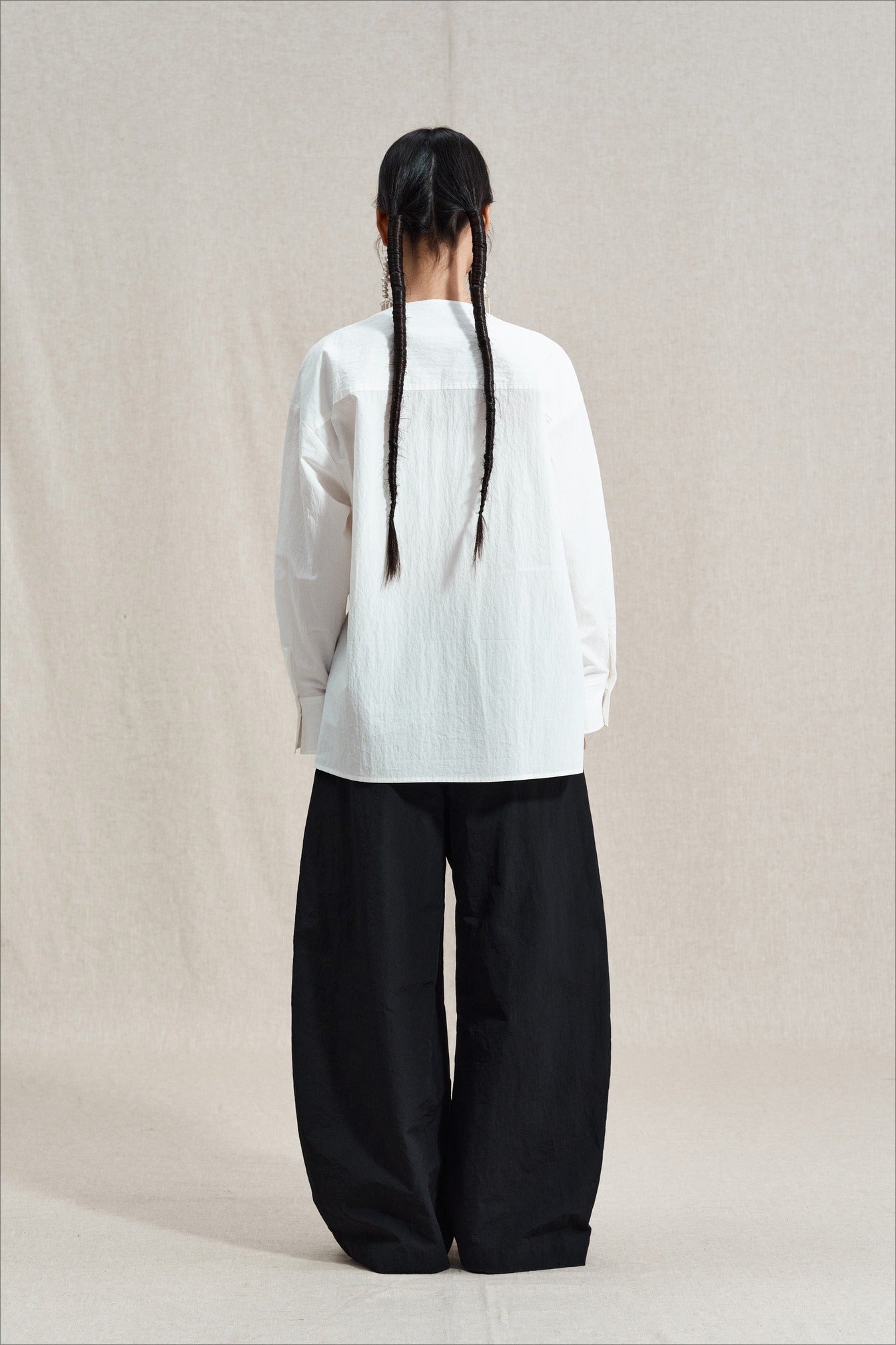 Pantalones holgados con silueta de capullo y textura similar al papel