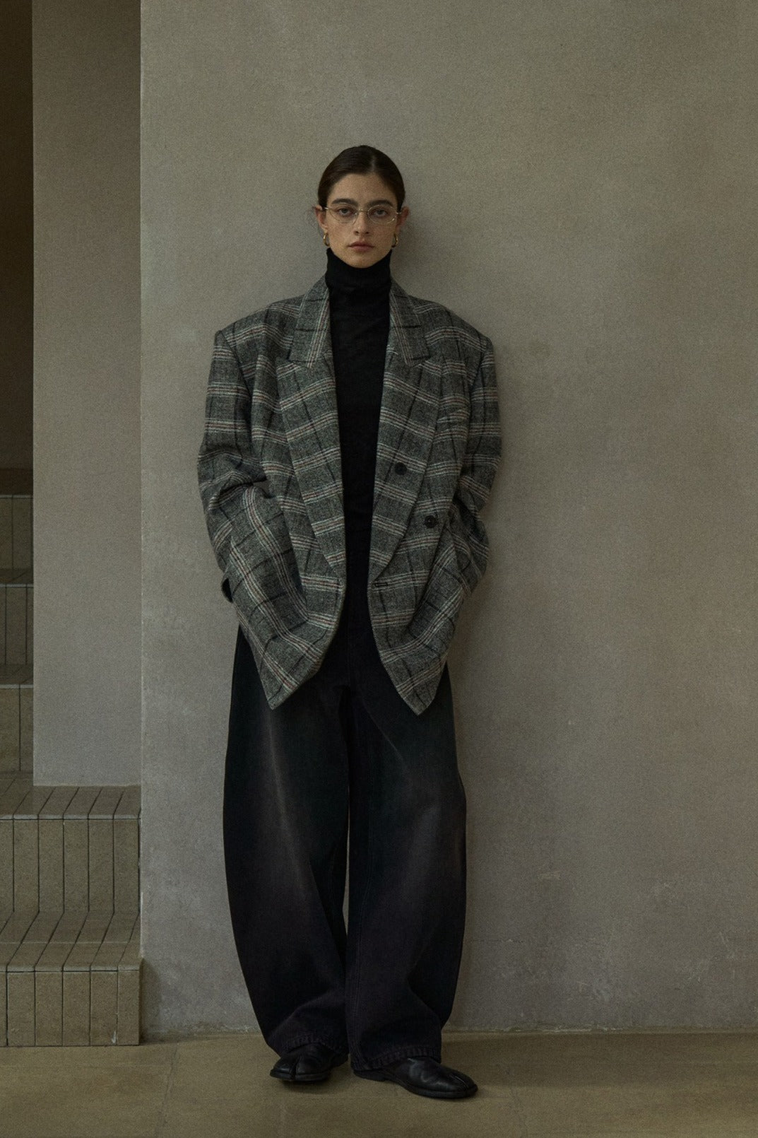 Wool containing plaid pattern super loose blazer black