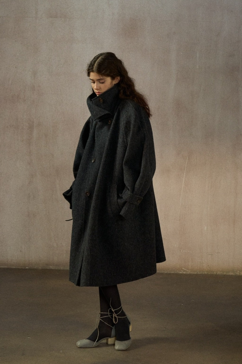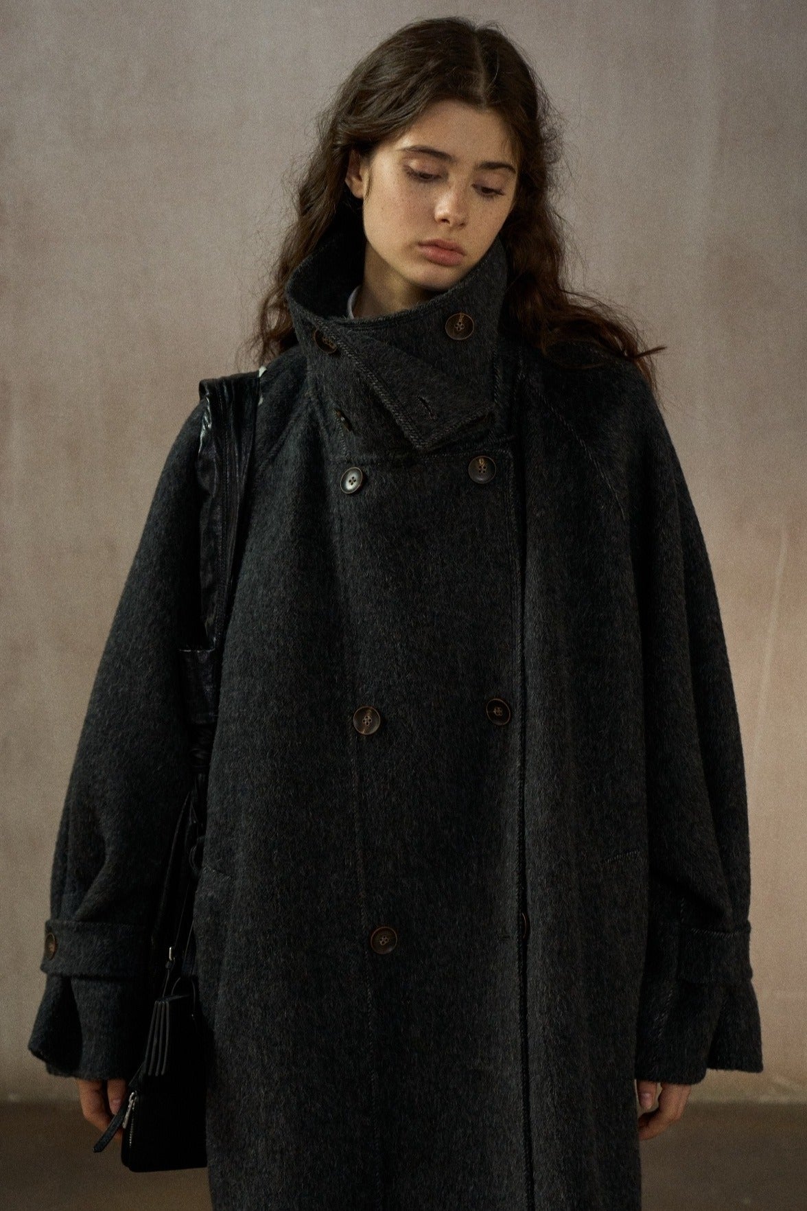 abrigo de lana, seda y angora de corte relajado y cuello alto hasta la rodilla.