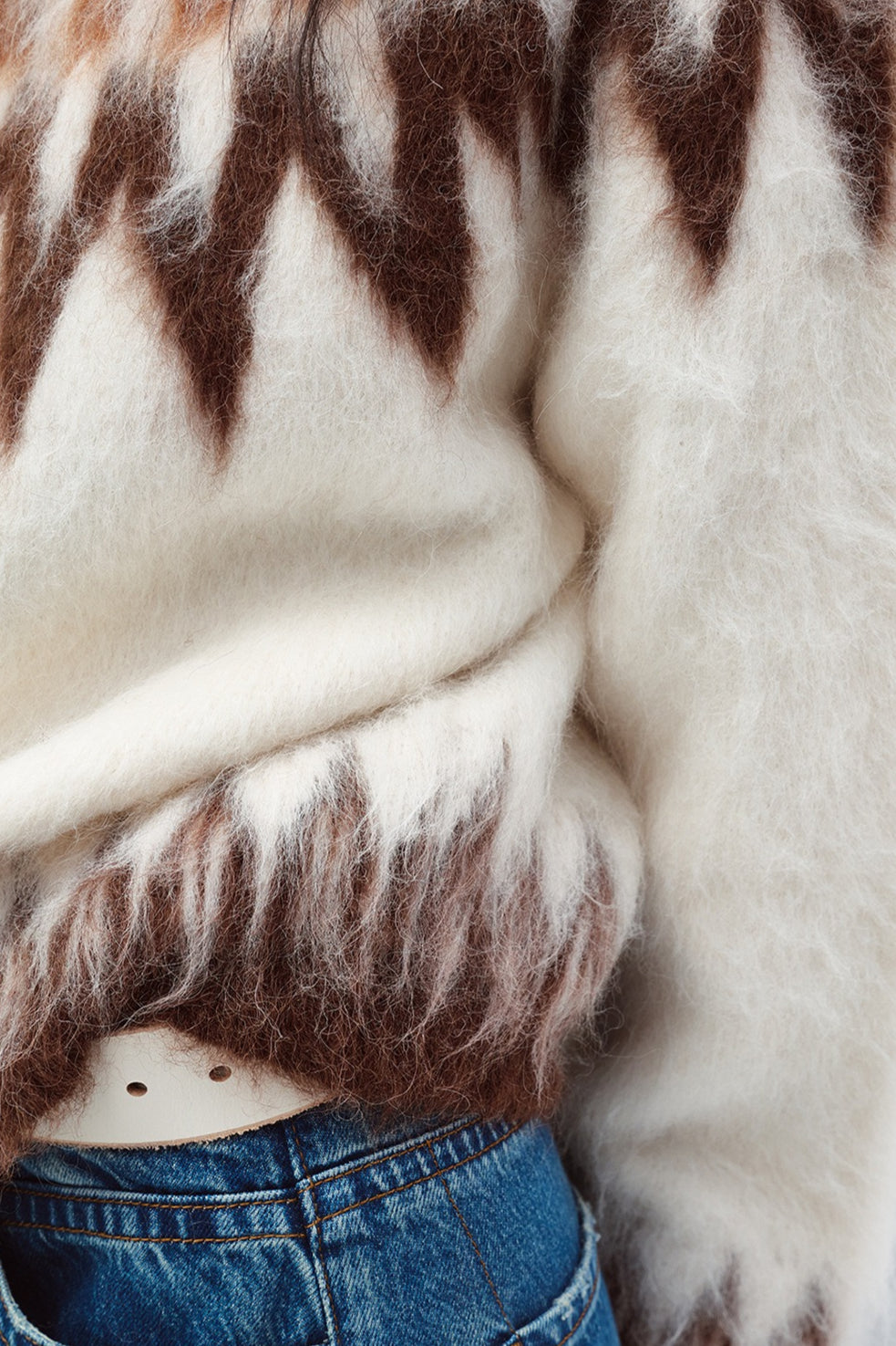 Este jersey holgado presenta una textura suave y cepillada y un estampado geométrico de inspiración vintage. Confeccionado en una mezcla de lana de alpaca de primera calidad, ofrece una calidez excepcional y una silueta cómoda y relajada, perfecta para combinar con estilo en invierno.