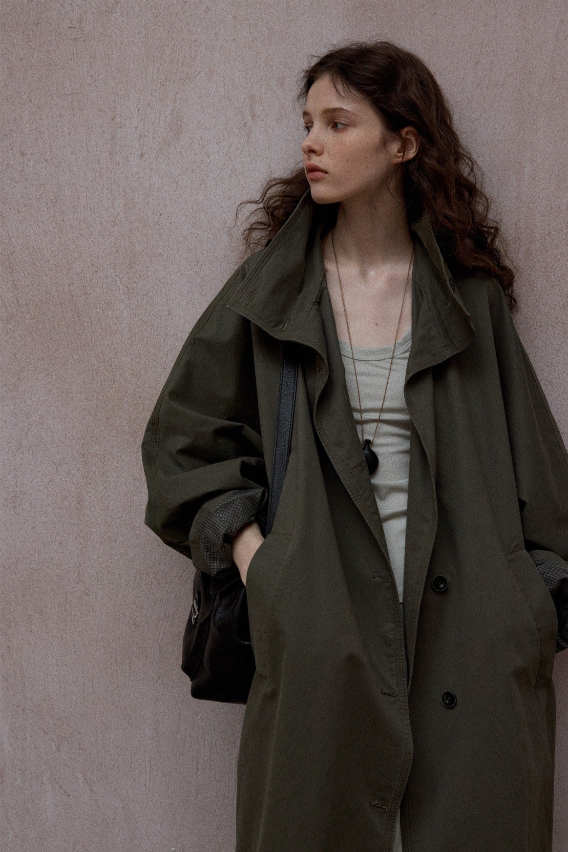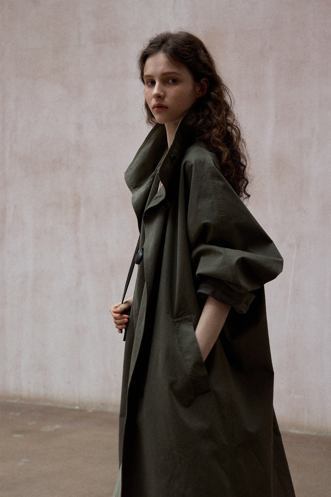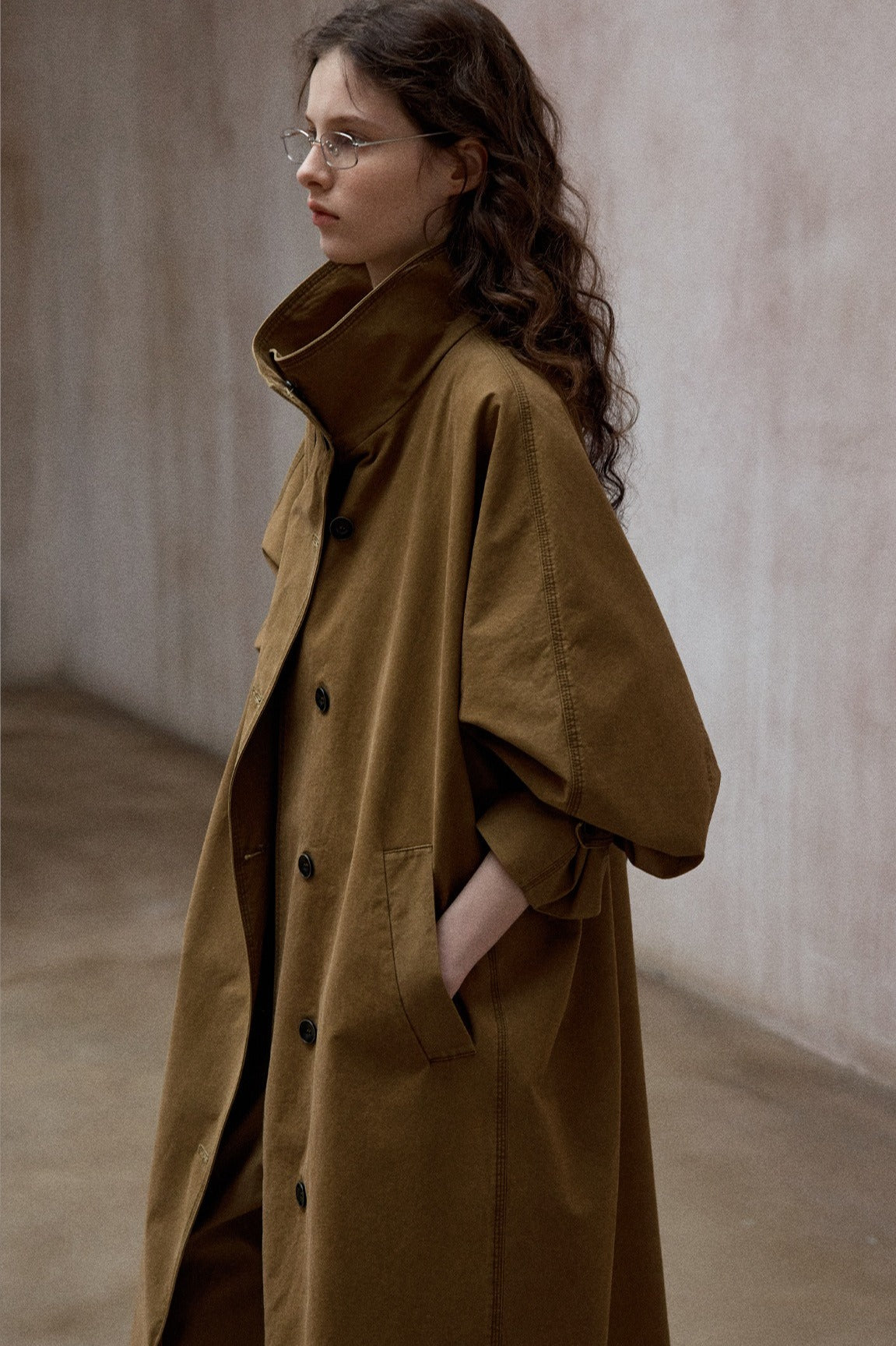 Esta gabardina de algodón presenta un corte holgado, mangas tipo murciélago y cuello alto para un look versátil y cotidiano.