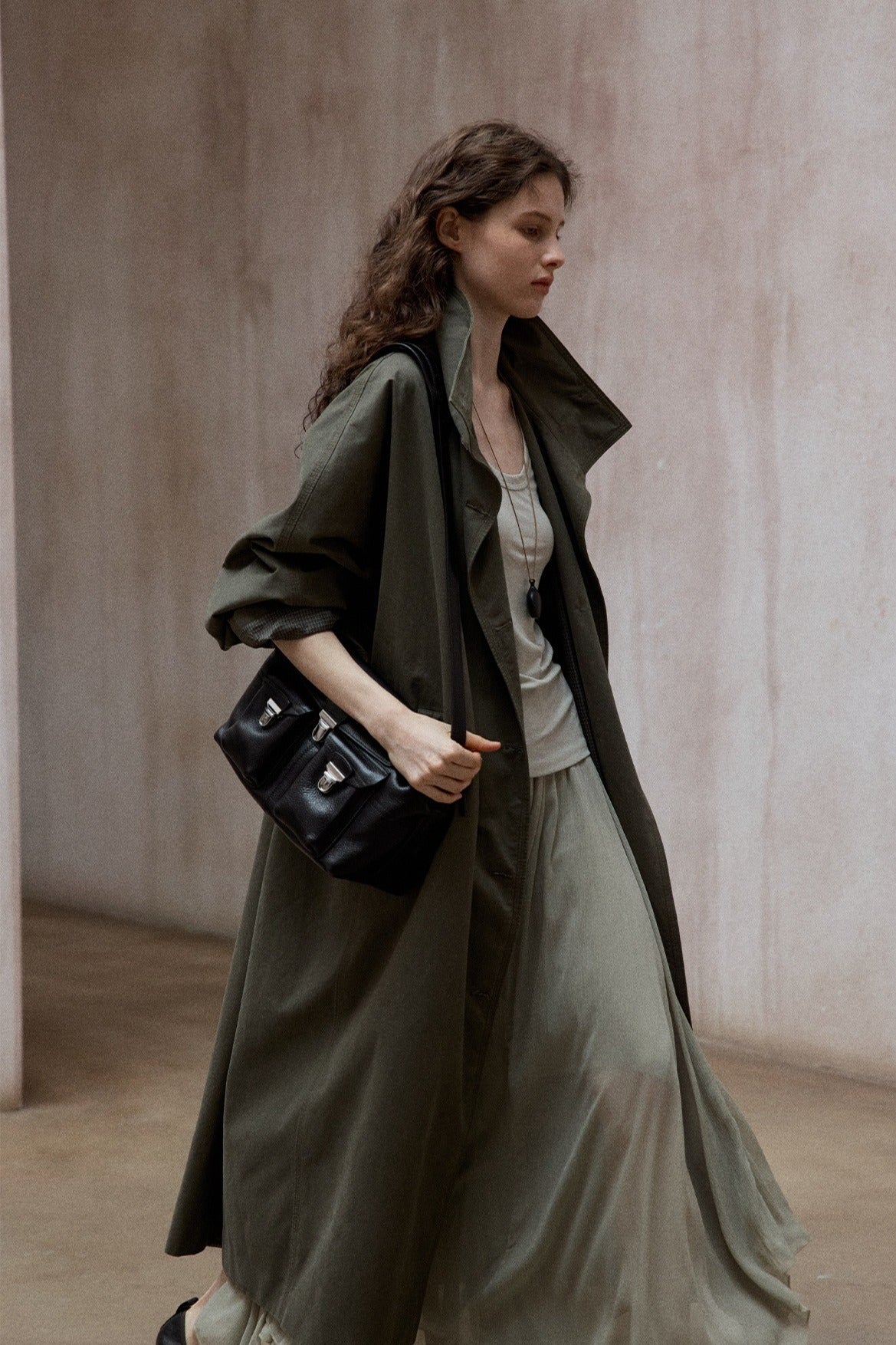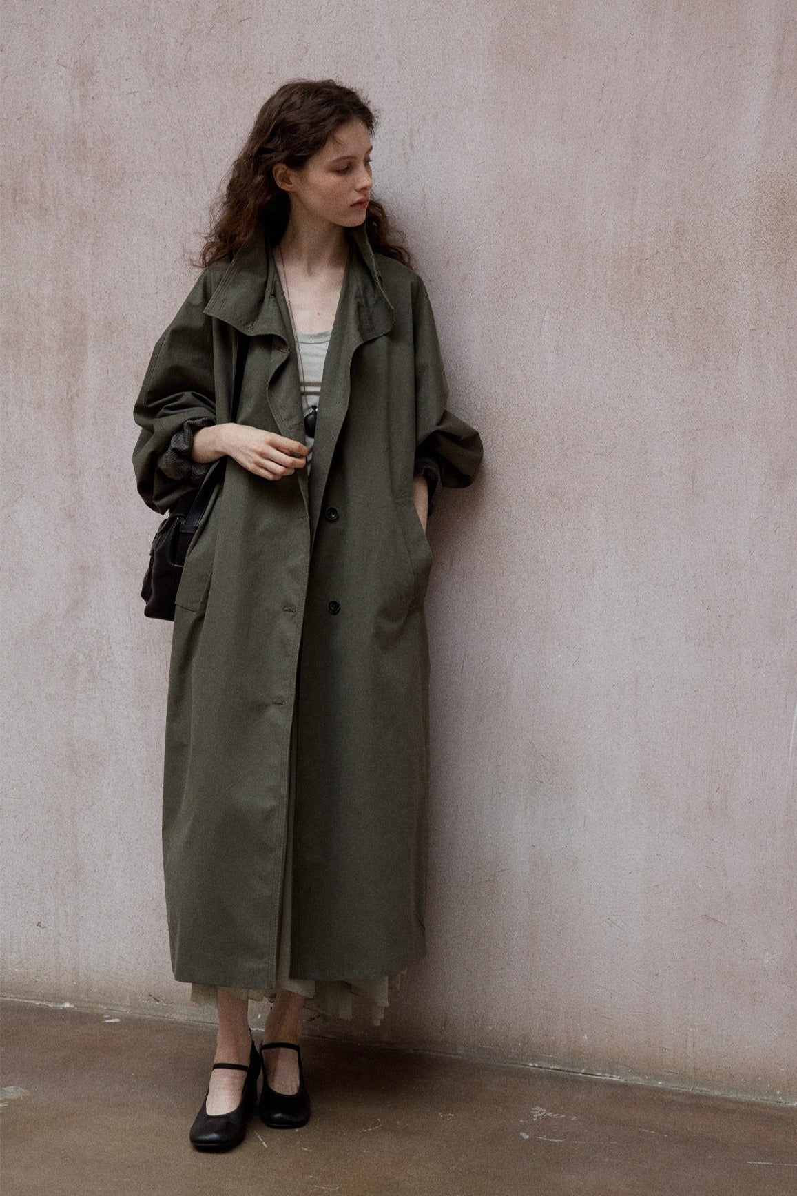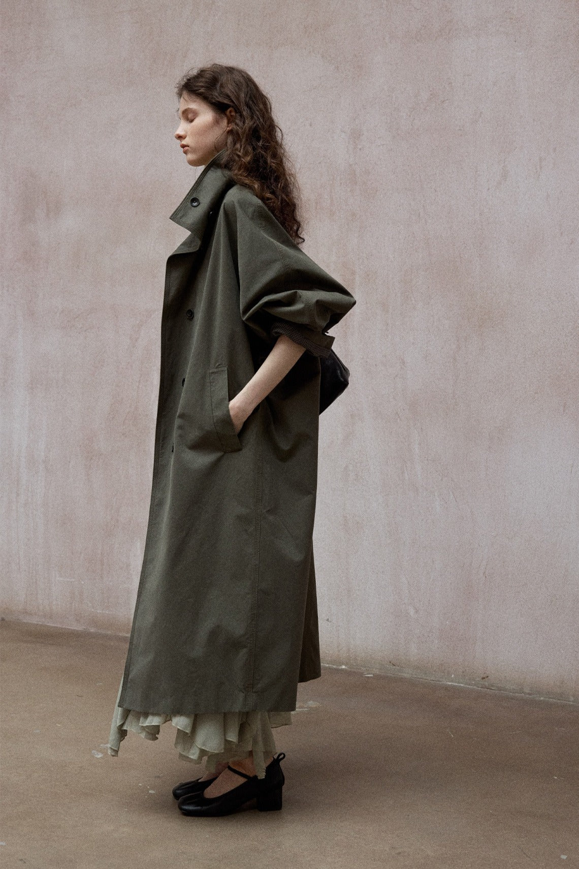Esta gabardina de algodón presenta un corte holgado, mangas tipo murciélago y cuello alto para un look versátil y cotidiano.