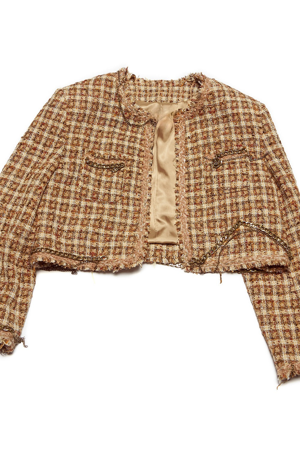 Chaqueta corta de tweed con borde irregular y ribete de cadena | 2 colores