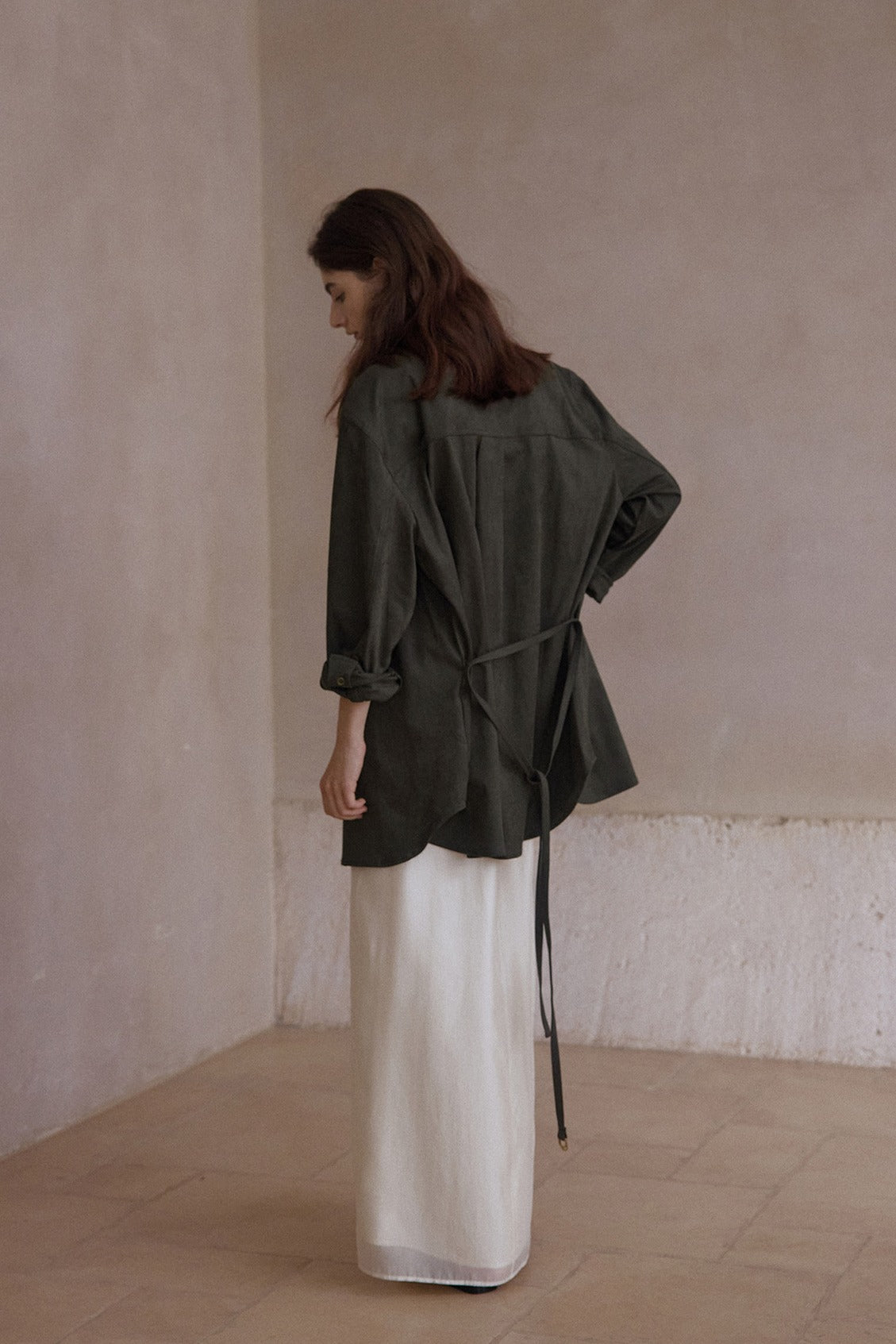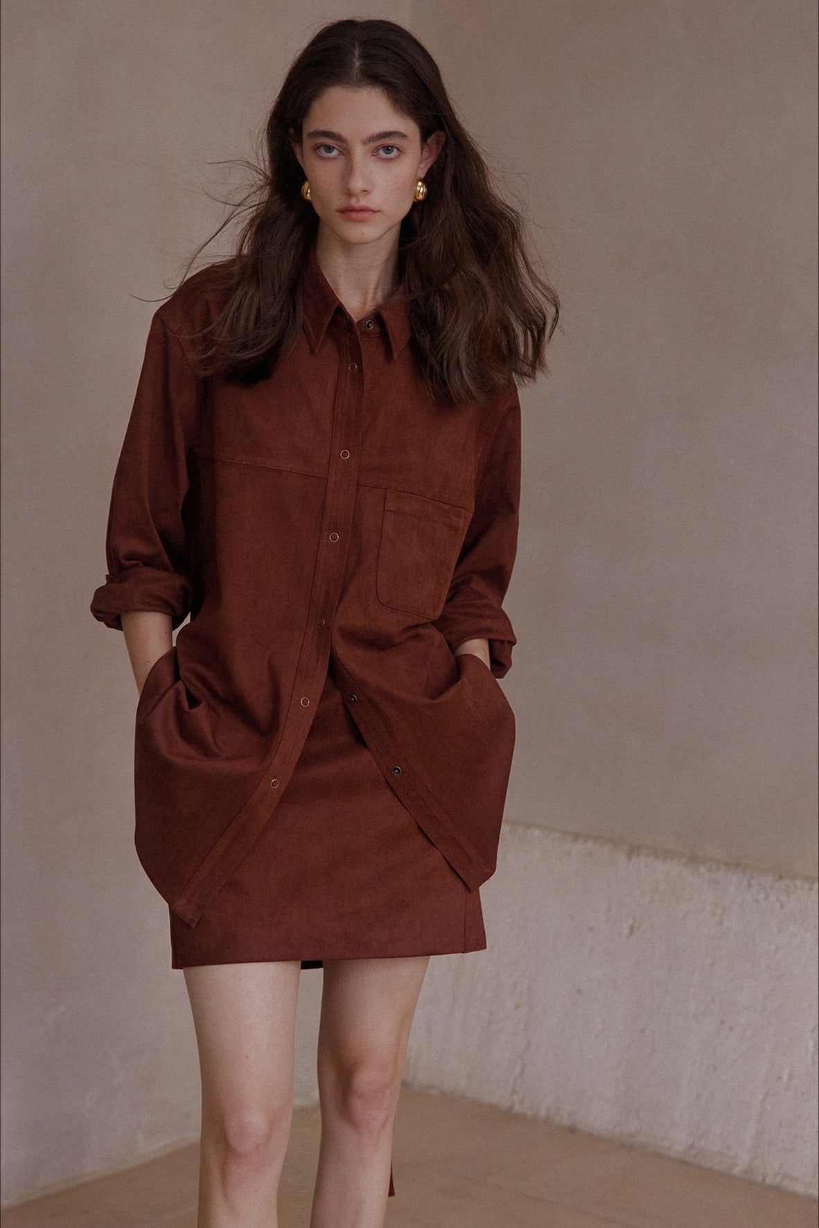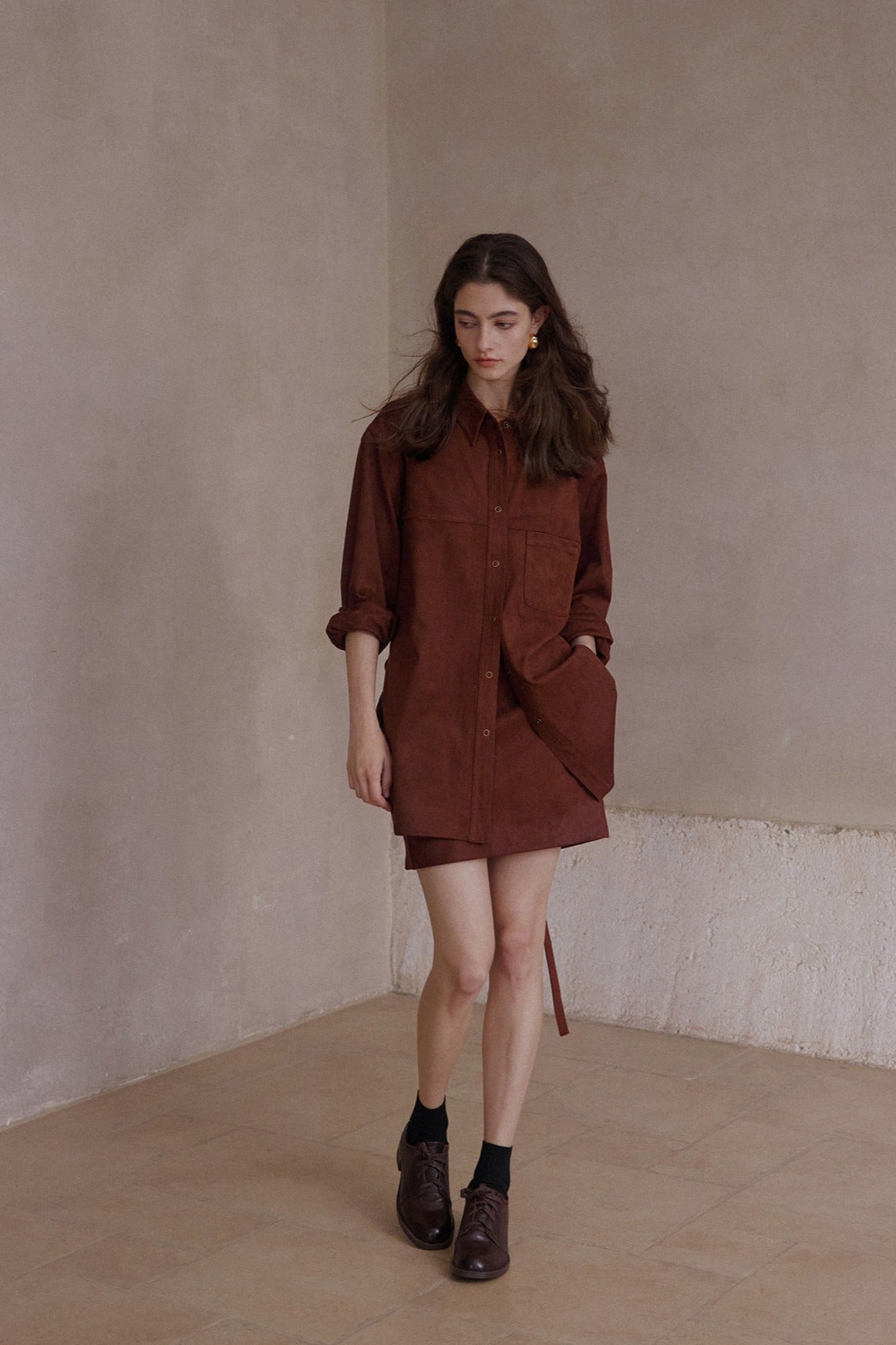 Elastic mid-length suede feel drawstring waist shirt-jacket | 3 color