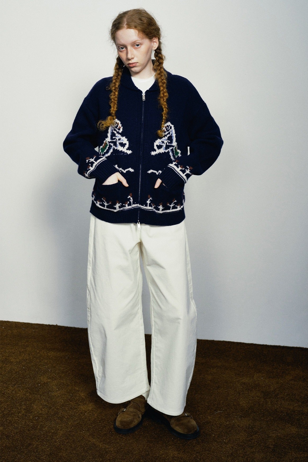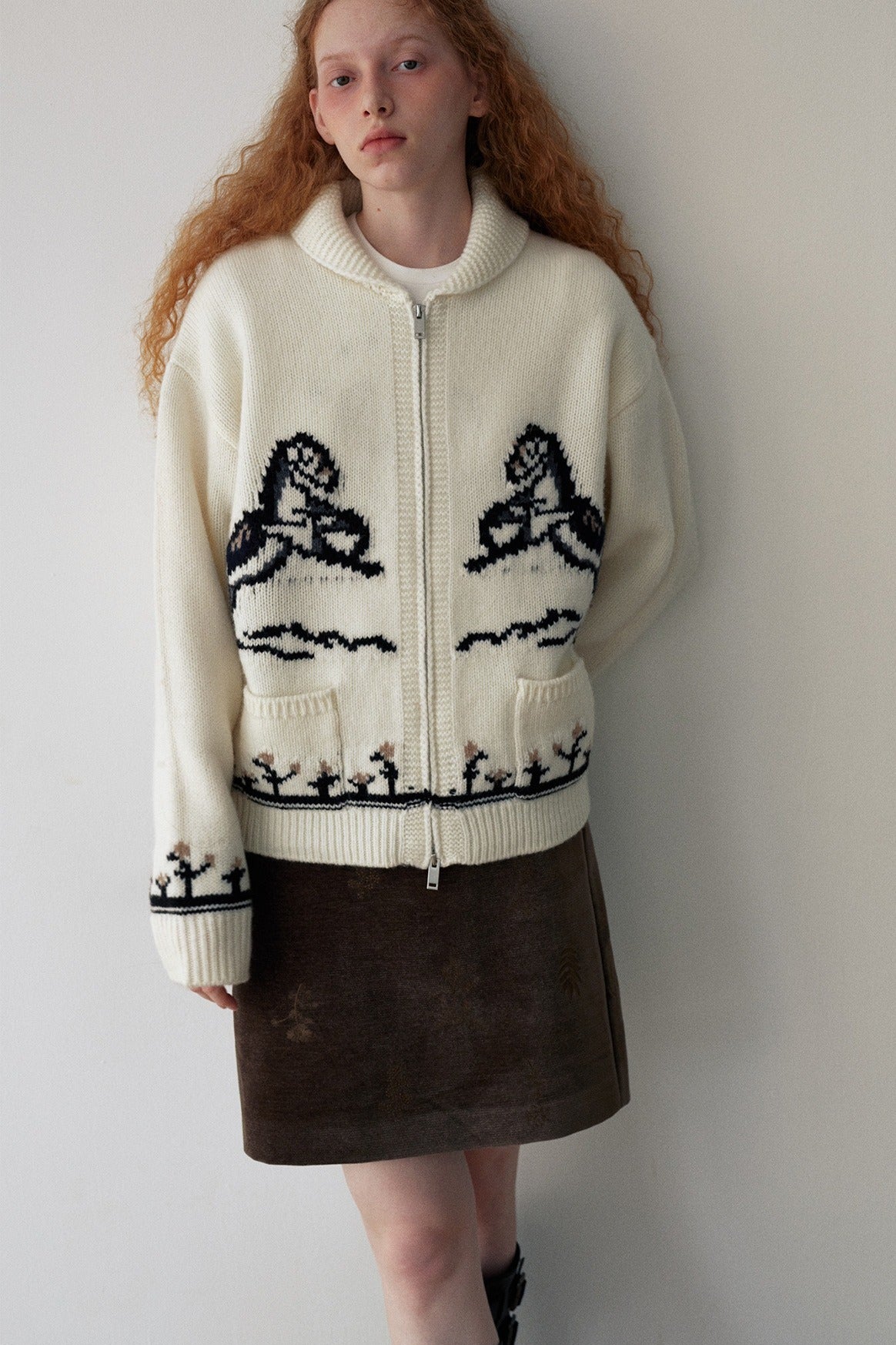 Este cárdigan de punto de inspiración vintage presenta un divertido estampado jacquard "Caballito pisando nieve". Confeccionado con un cuerpo de lana de oveja 100 % premium para mayor calidez, cuenta con un acogedor cuello de solapa y un práctico cierre de cremallera, combinando la comodidad informal con una estética retro.