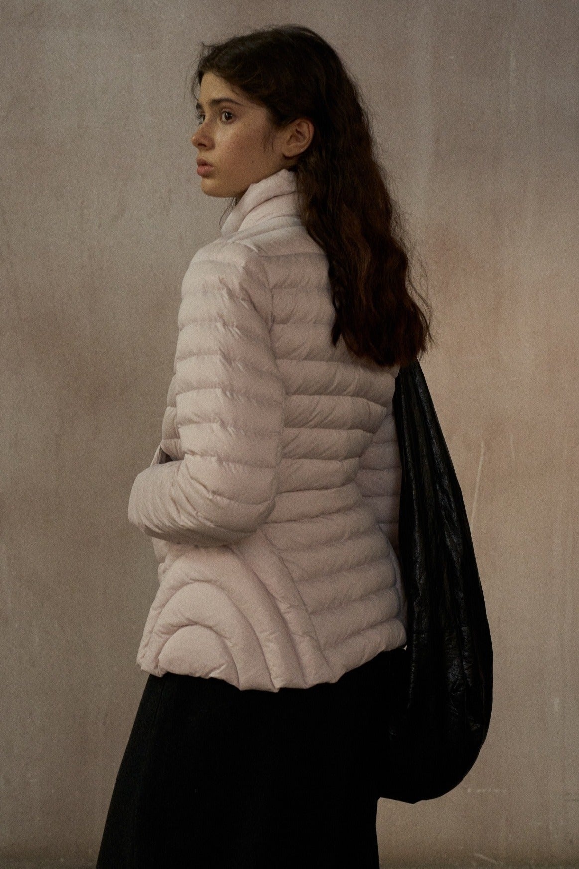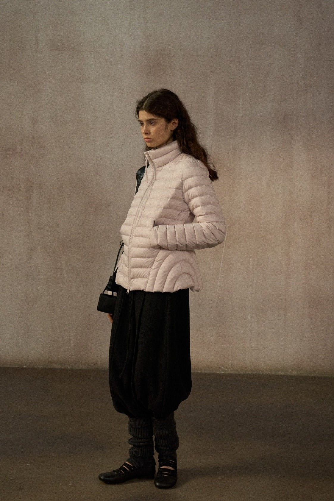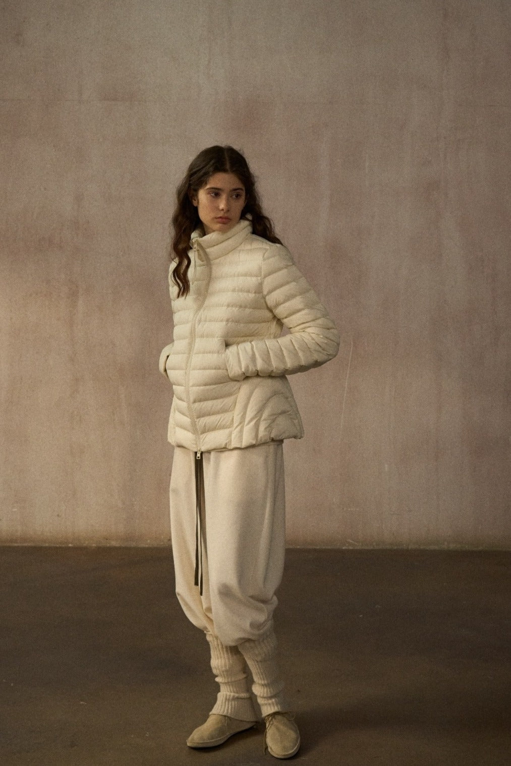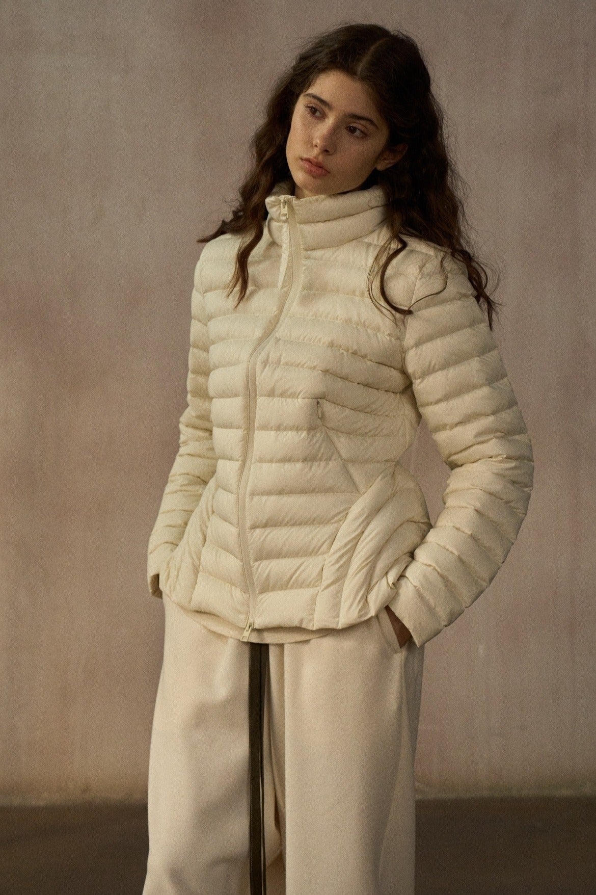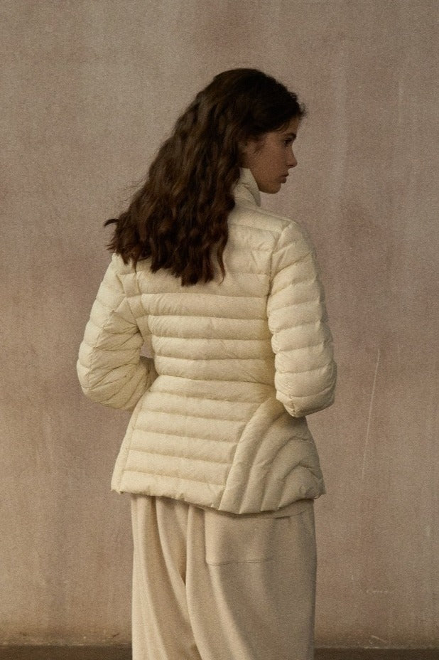 Esta chaqueta ligera de plumón presenta un cuello alto y una silueta entallada con cintura marcada. Rellena de plumón de pato blanco, ofrece calidez con un diseño elegante y moderno.