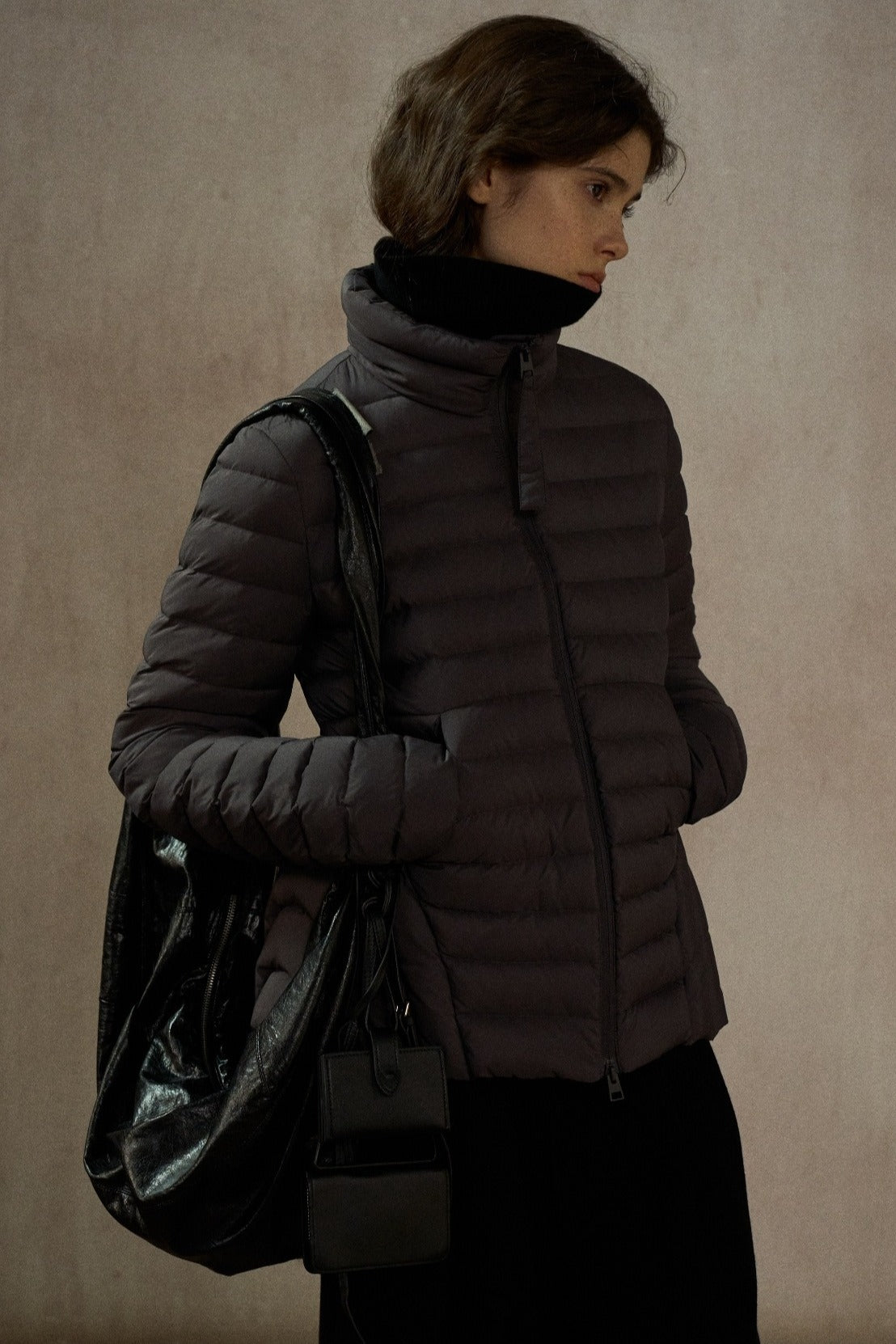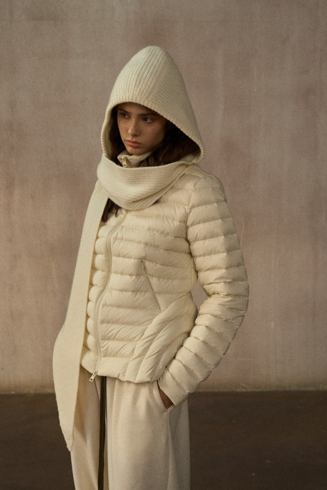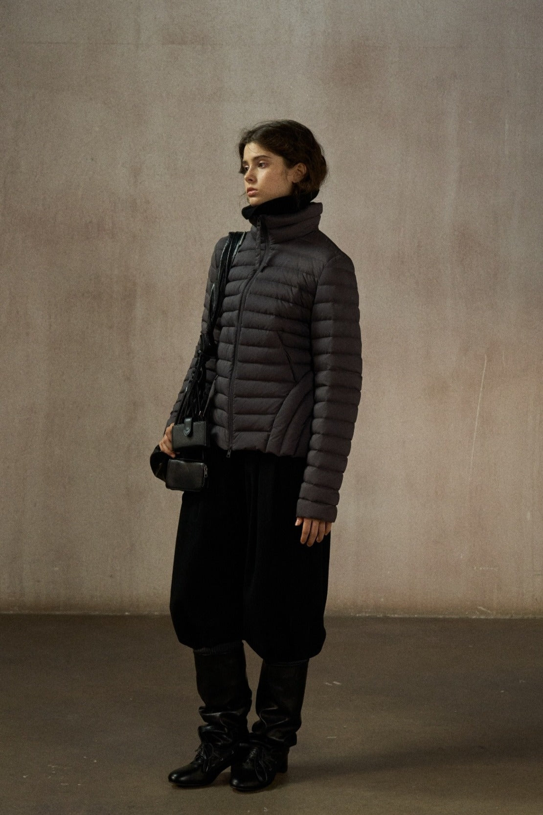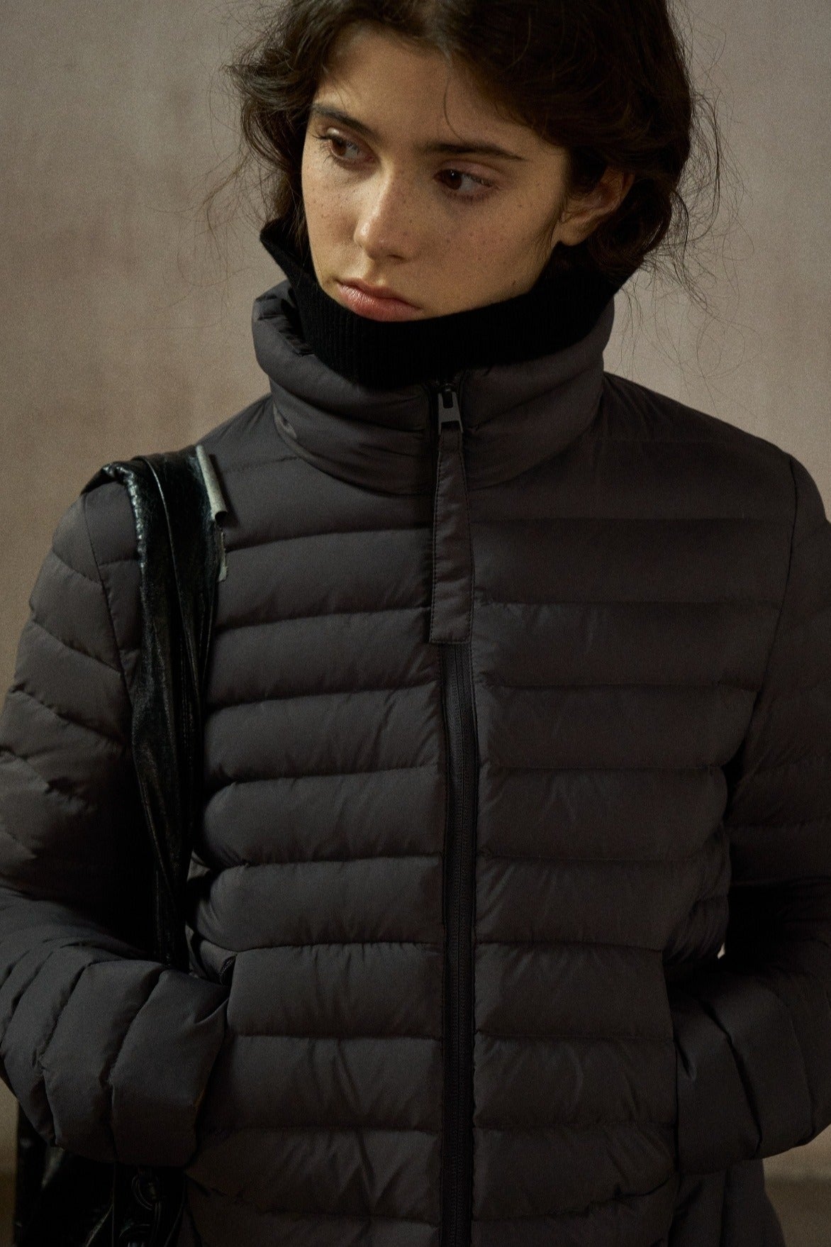 Esta chaqueta ligera de plumón presenta un cuello alto y una silueta entallada con cintura marcada. Rellena de plumón de pato blanco, ofrece calidez con un diseño elegante y moderno.