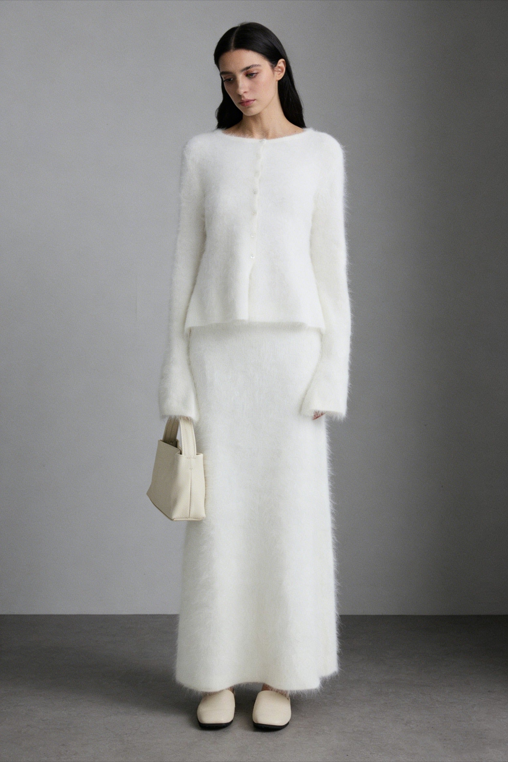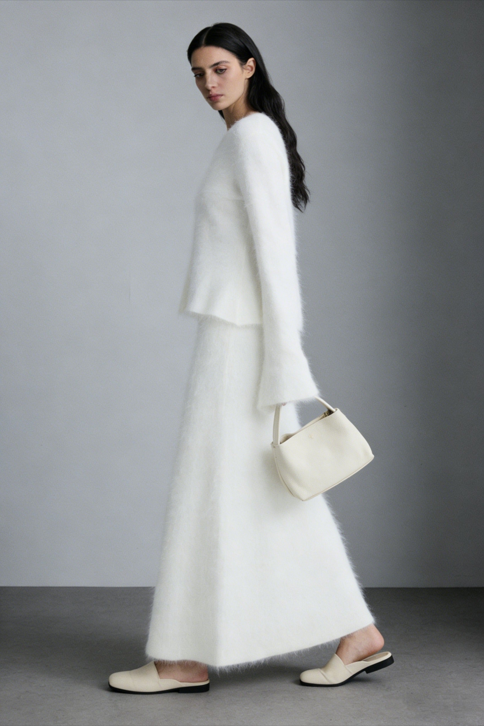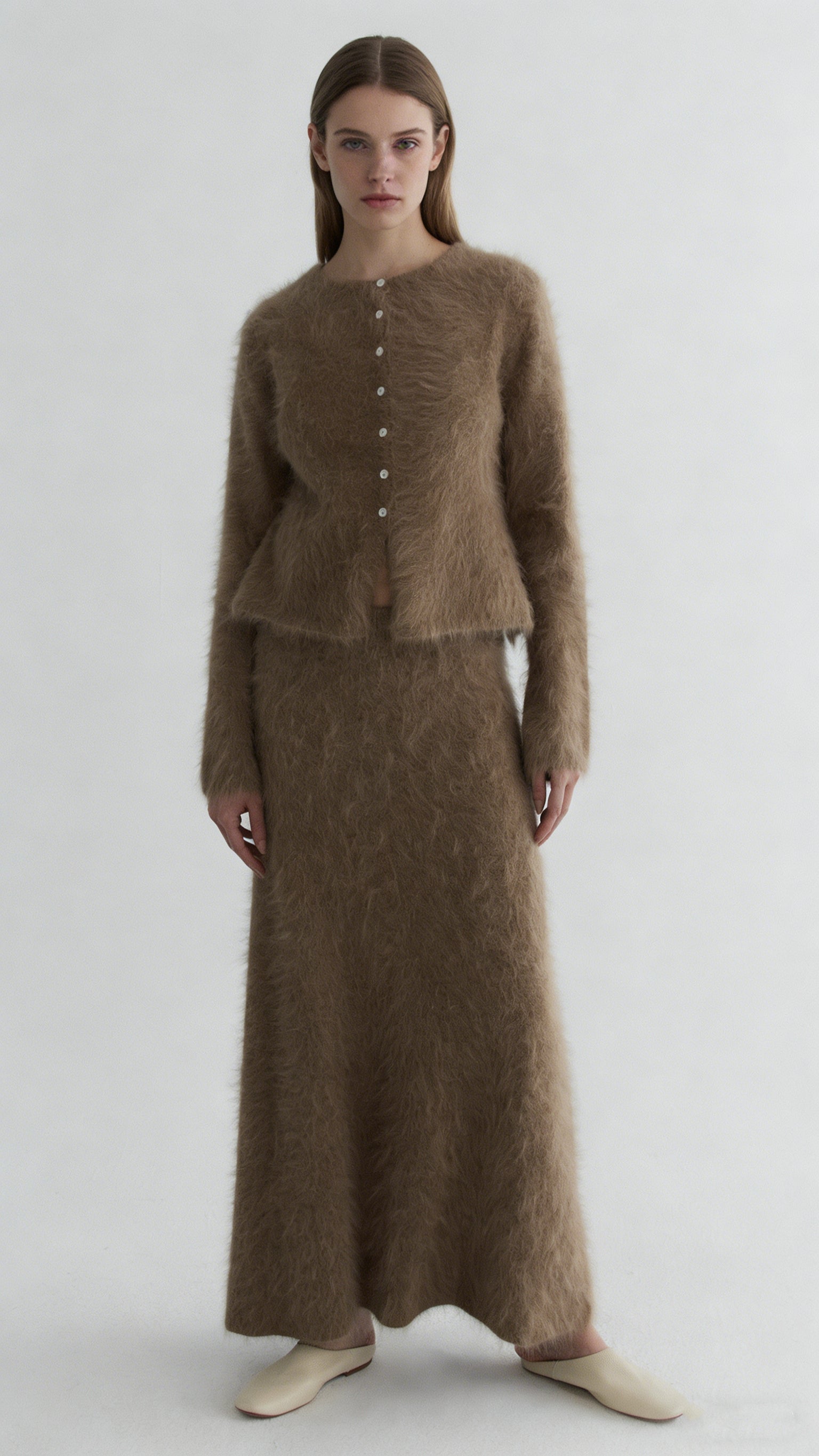 El tejido de punto en mezcla de vellón nutria se extiende hasta convertirse en un maxi fluido de corte A: la suave felpa atrapa la luz y su calidez ligera se mece con cada paso. Cintura elástica, silueta impecable: elegancia sin cordones que combina con mocasines o tacones para un lujo invernal sobrio.