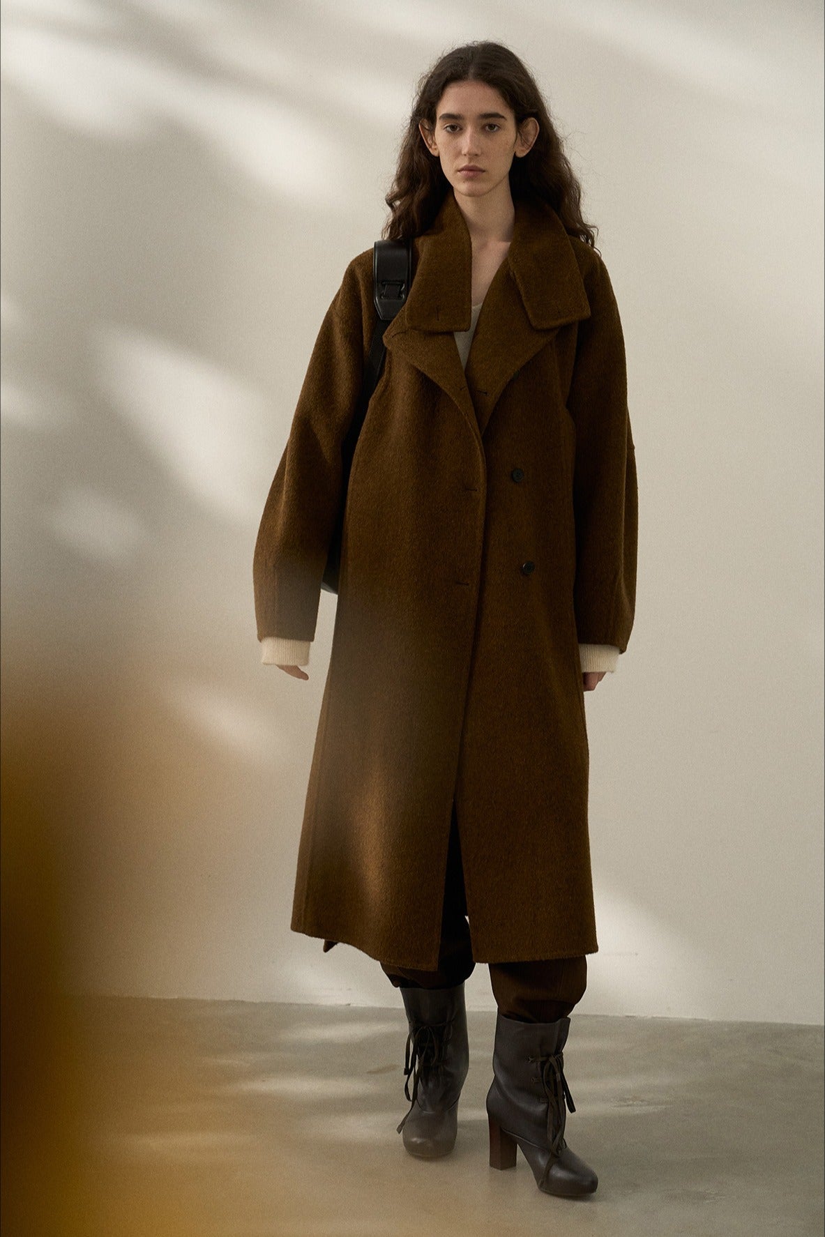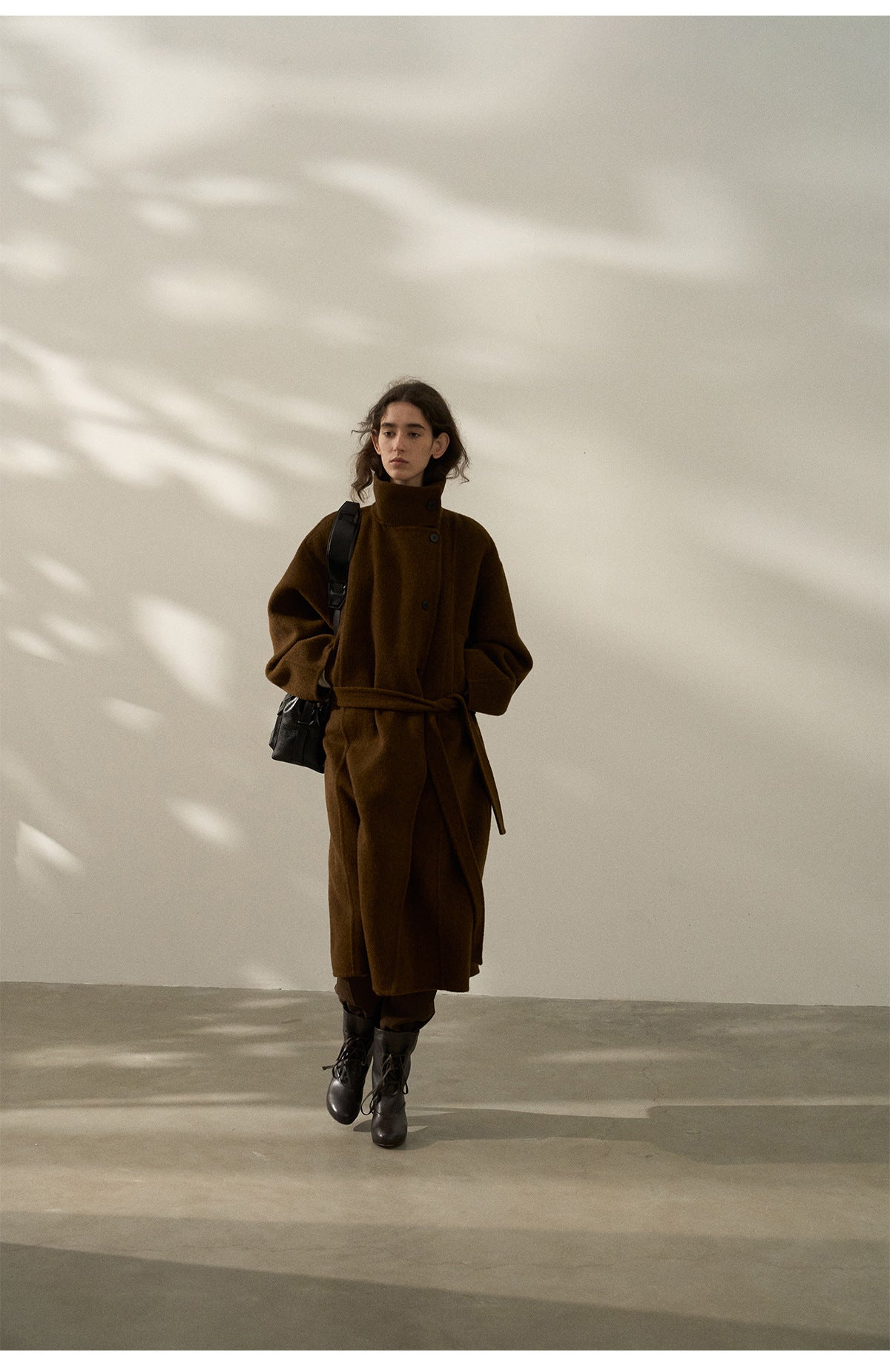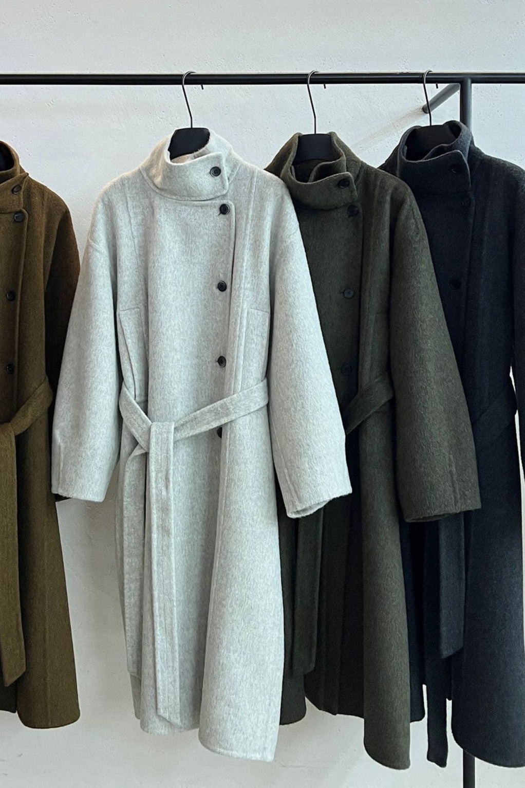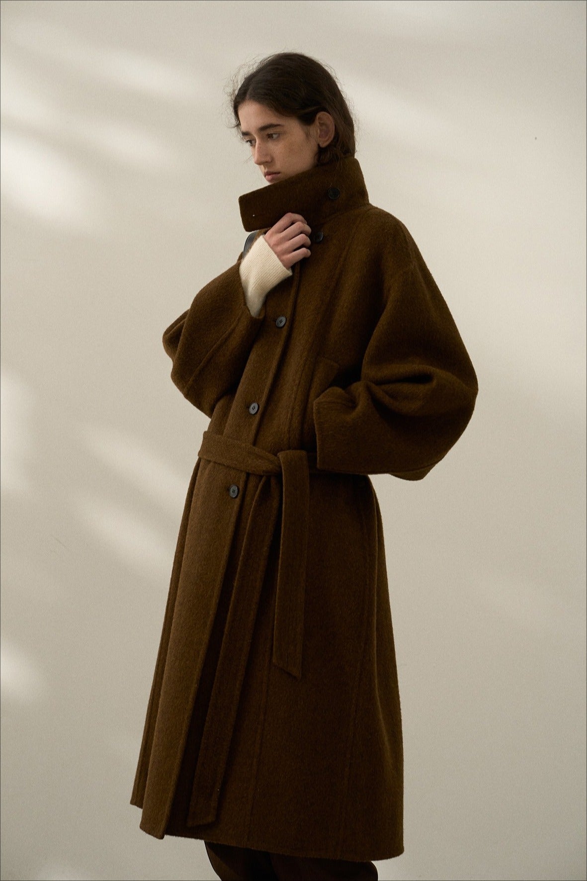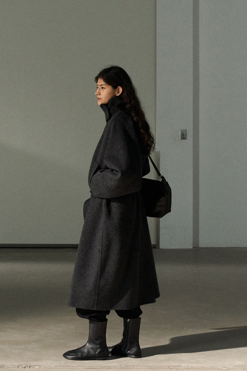 Abrigo largo premium hecho a mano, confeccionado en una mezcla de lana de oveja y alpaca. Este abrigo de tela de doble cara luce un cuello alto único con un diseño separado, que ofrece comodidad y elegancia.