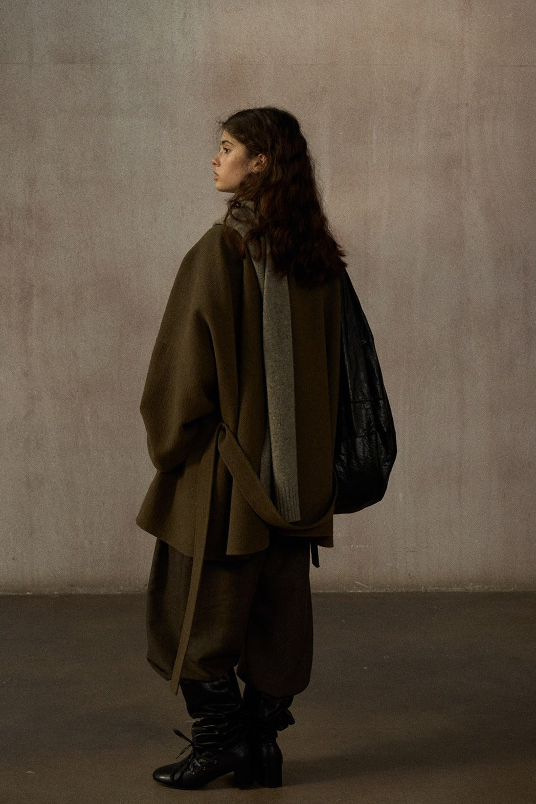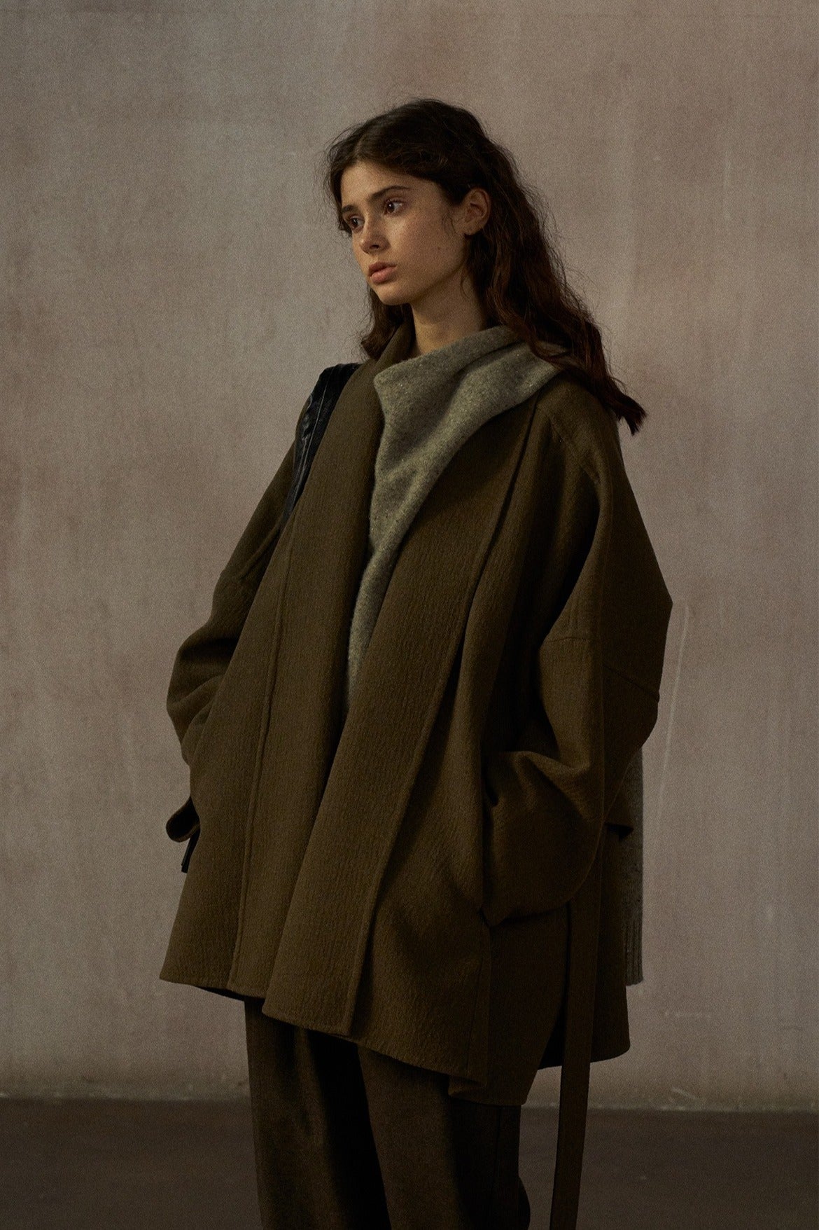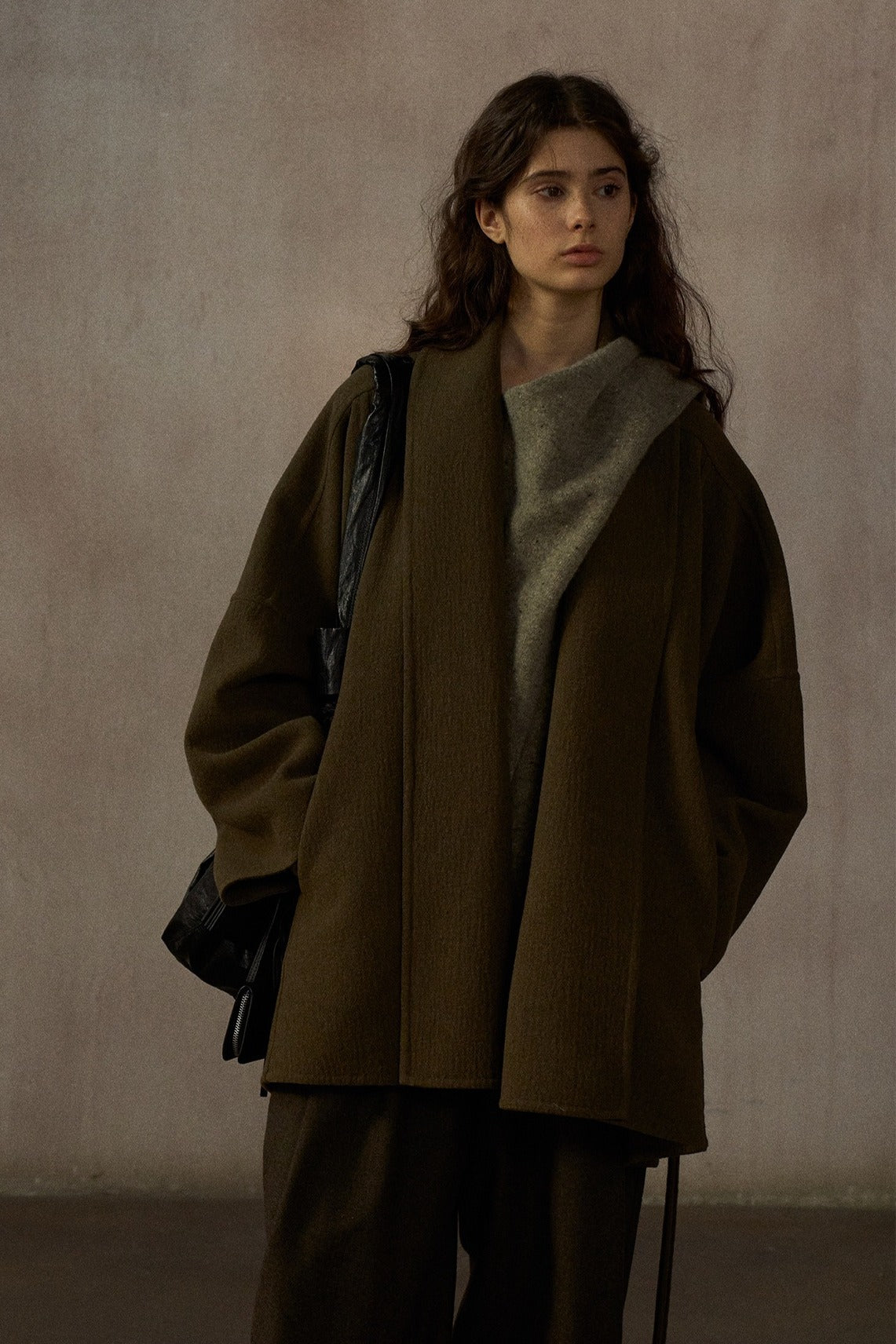 Este abrigo de doble faz, confeccionado en mezcla de lana, presenta una silueta tipo murciélago y un corte holgado. El cuello está unido a la tapeta, y los hombros caídos realzan su estilo casual y elegante.
