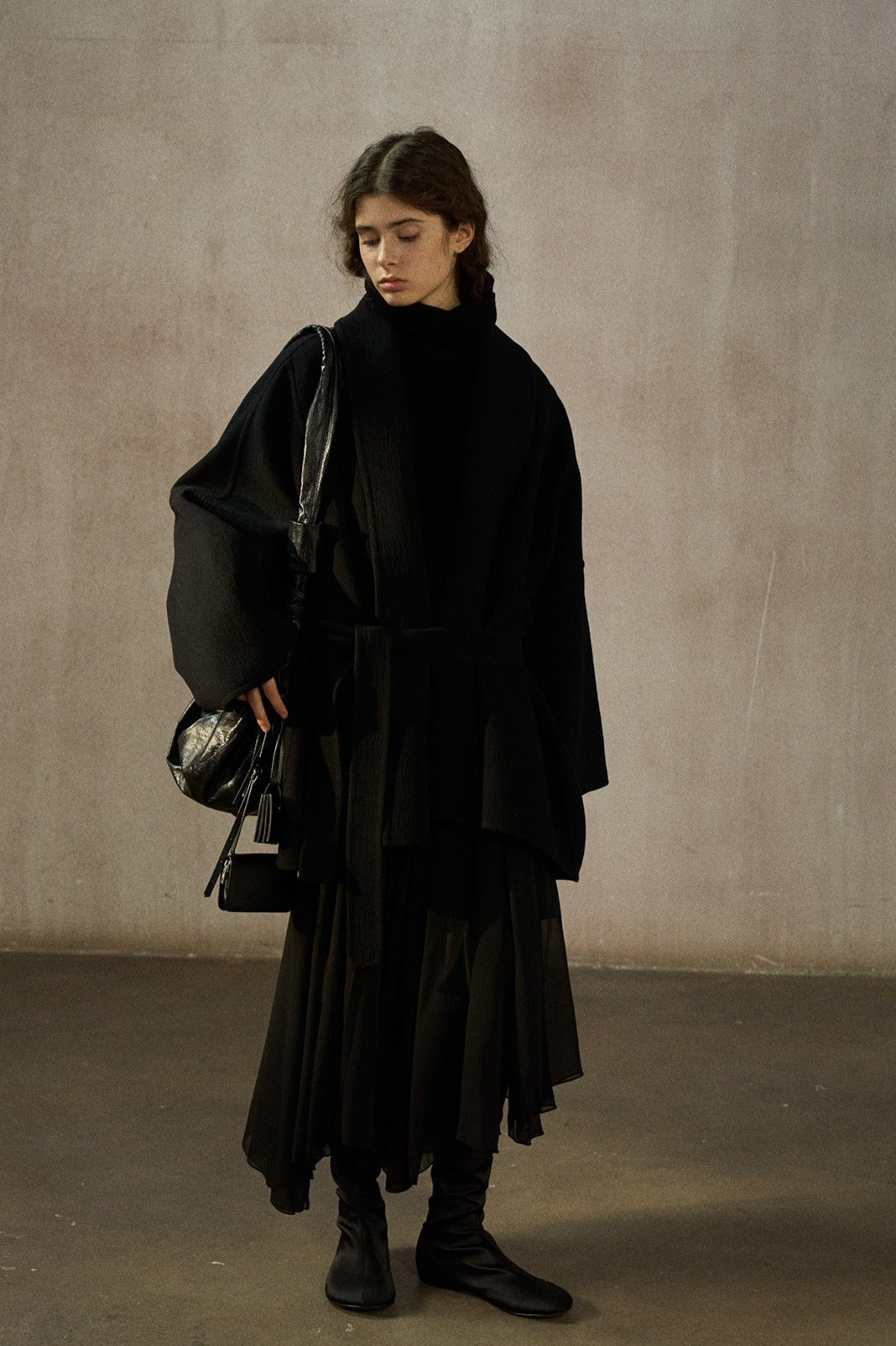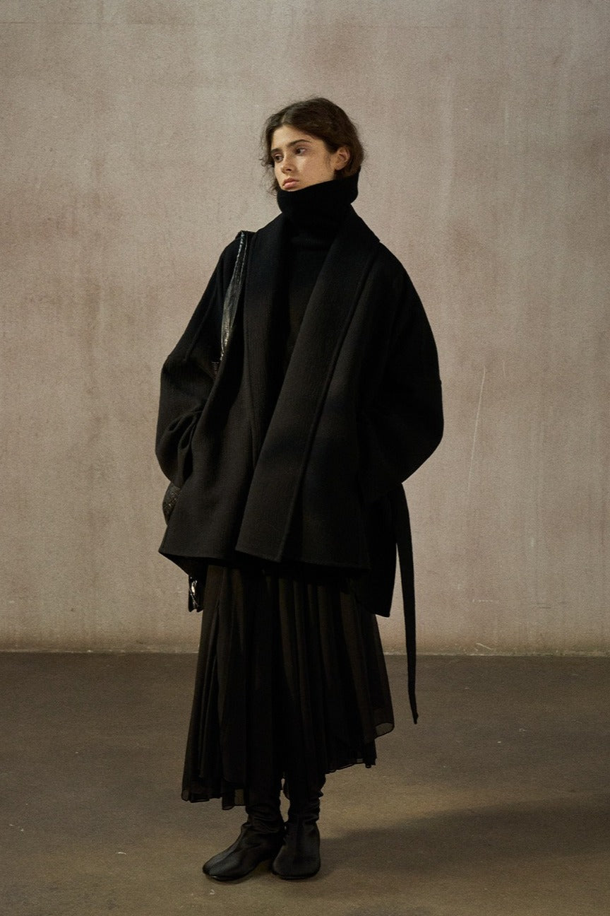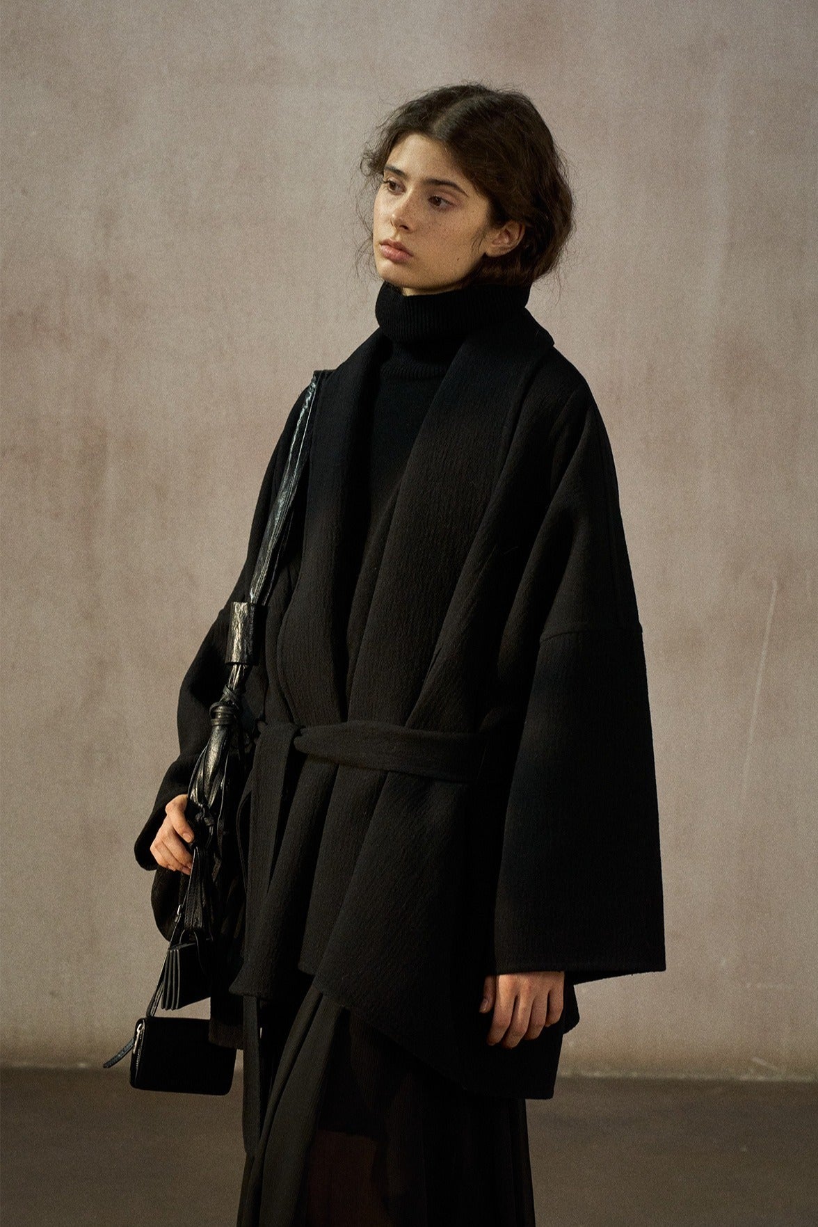 Este abrigo de doble faz, confeccionado en mezcla de lana, presenta una silueta tipo murciélago y un corte holgado. El cuello está unido a la tapeta, y los hombros caídos realzan su estilo casual y elegante.