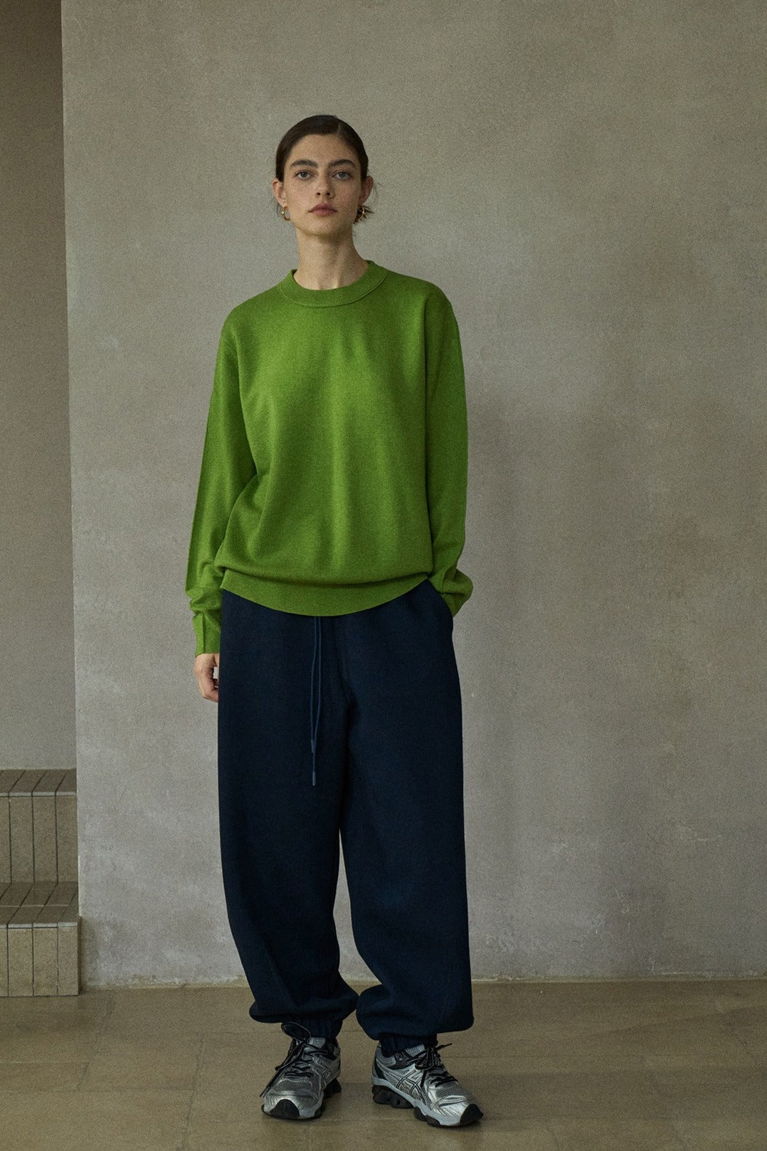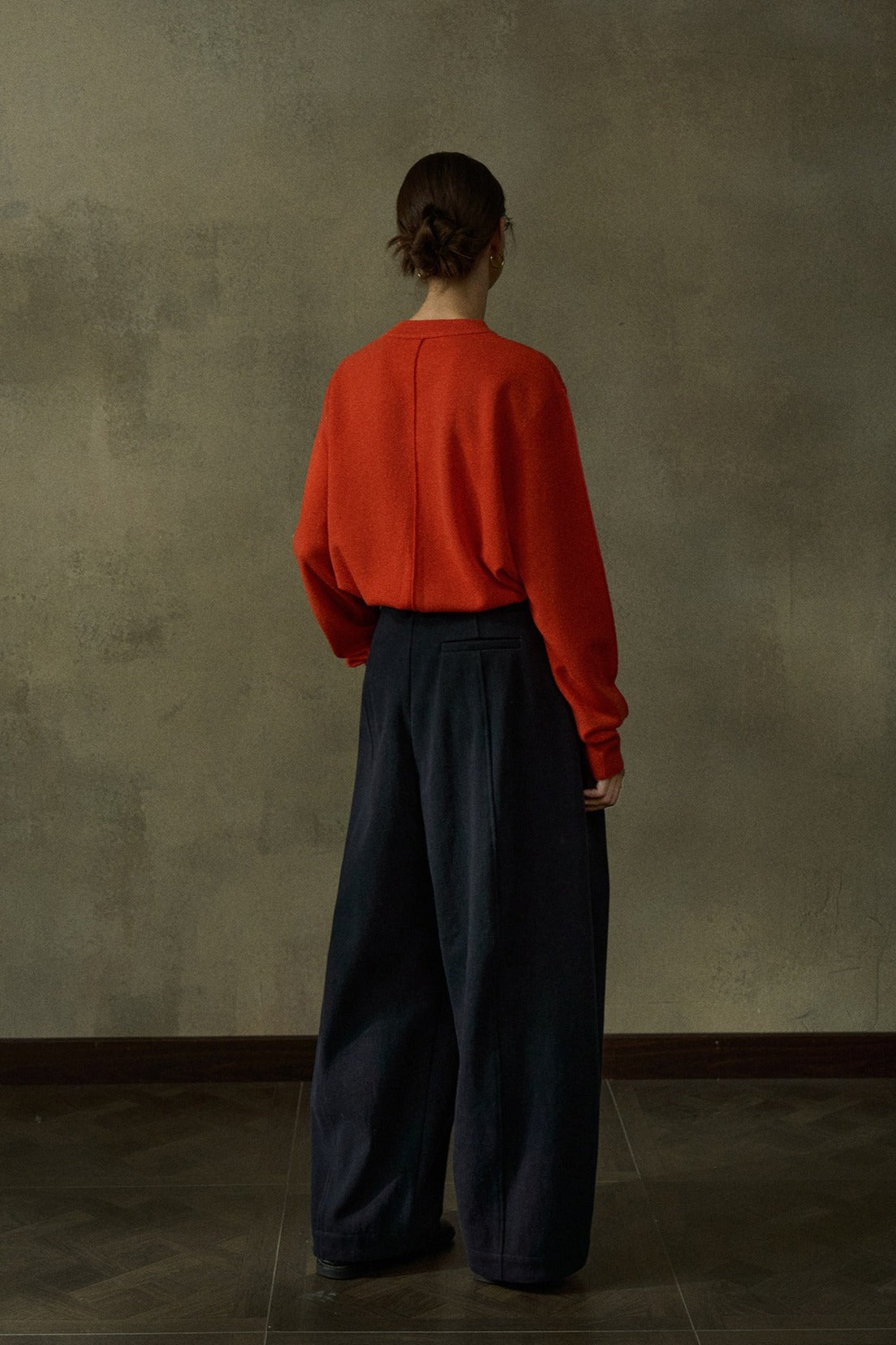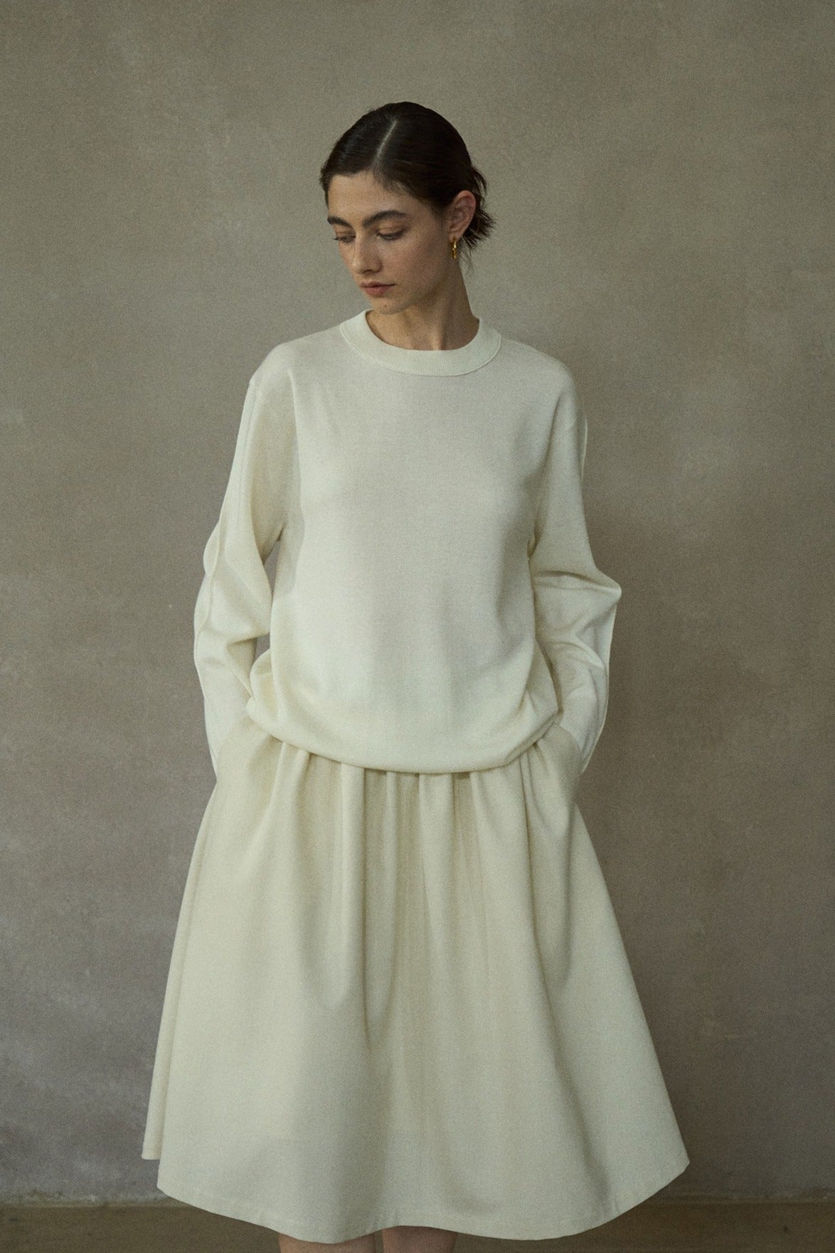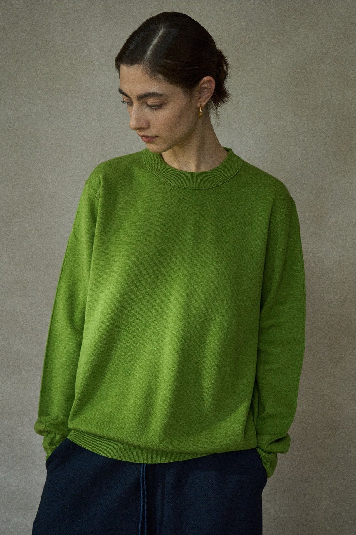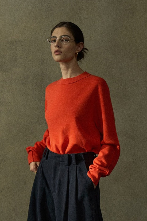 Este clásico y versátil suéter de punto está confeccionado en lana para mayor calidez. Presenta cuello redondo, mangas largas y un corte holgado. La espalda tiene una costura central y el bajo está ligeramente fruncido para un acabado impecable.