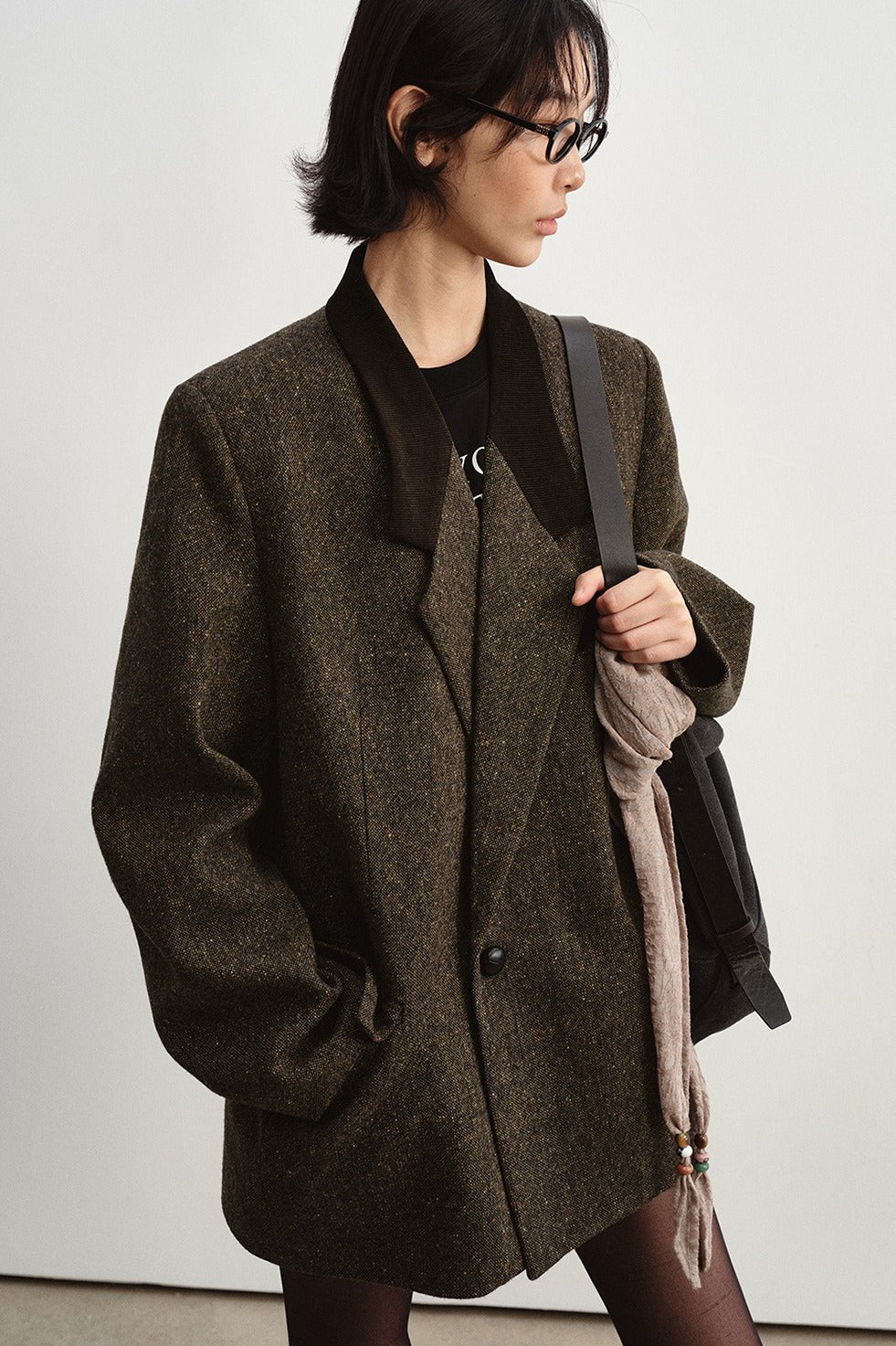 Esta chaqueta de traje de corte holgado, confeccionada en mezcla de lana, presenta un cuello de estilo vintage en color contrastante que crea un llamativo efecto visual. El cierre de un solo botón y las mangas largas le aportan un toque de sofisticación, convirtiéndola en la prenda perfecta para un look invernal elegante.