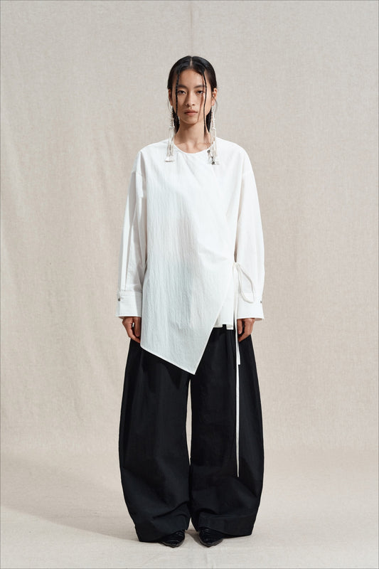 Chemise en coton mélangé à ourlet irrégulier et ouverture oblique | 2 couleurs