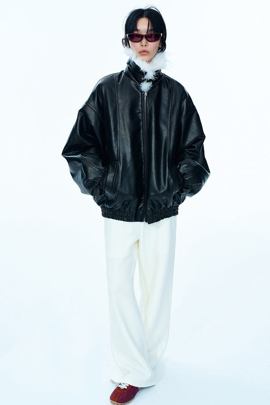 Relaxed-fit cozy collar trendy PU jacket | 2 color