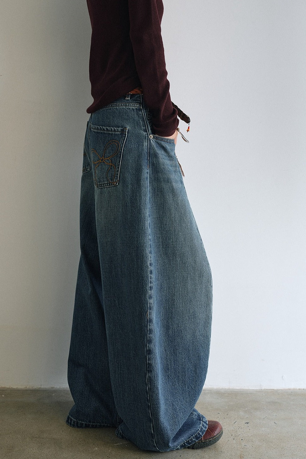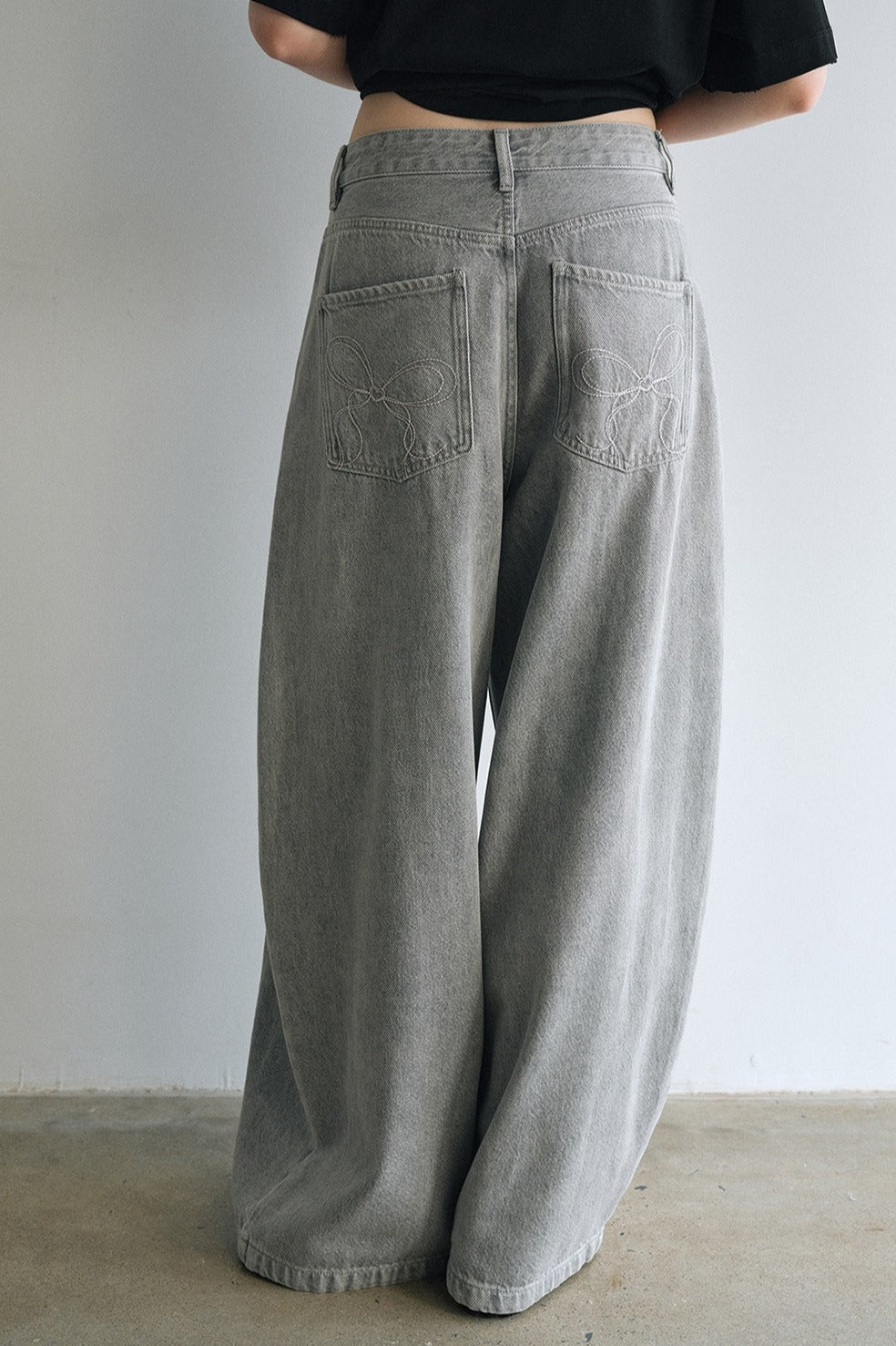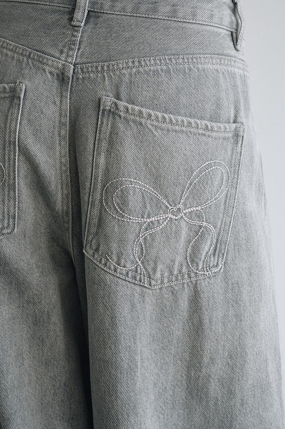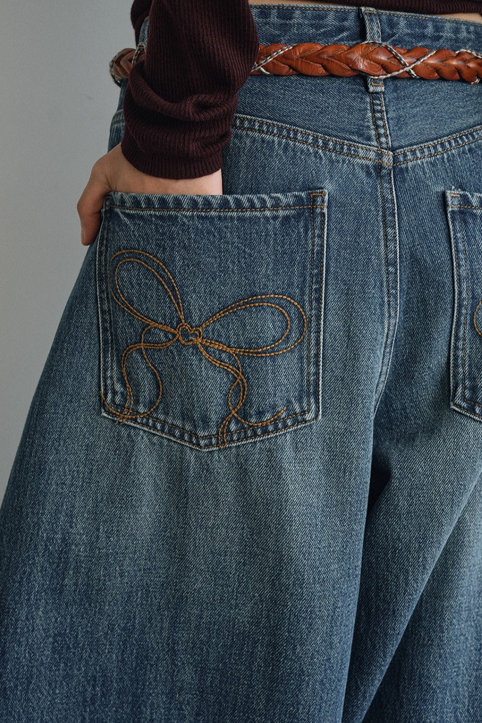 These relaxed-fit jeans feature a washed finish, a guava-inspired silhouette, and embroidered bow details on the back pockets. Perfect for a cool, edgy look.