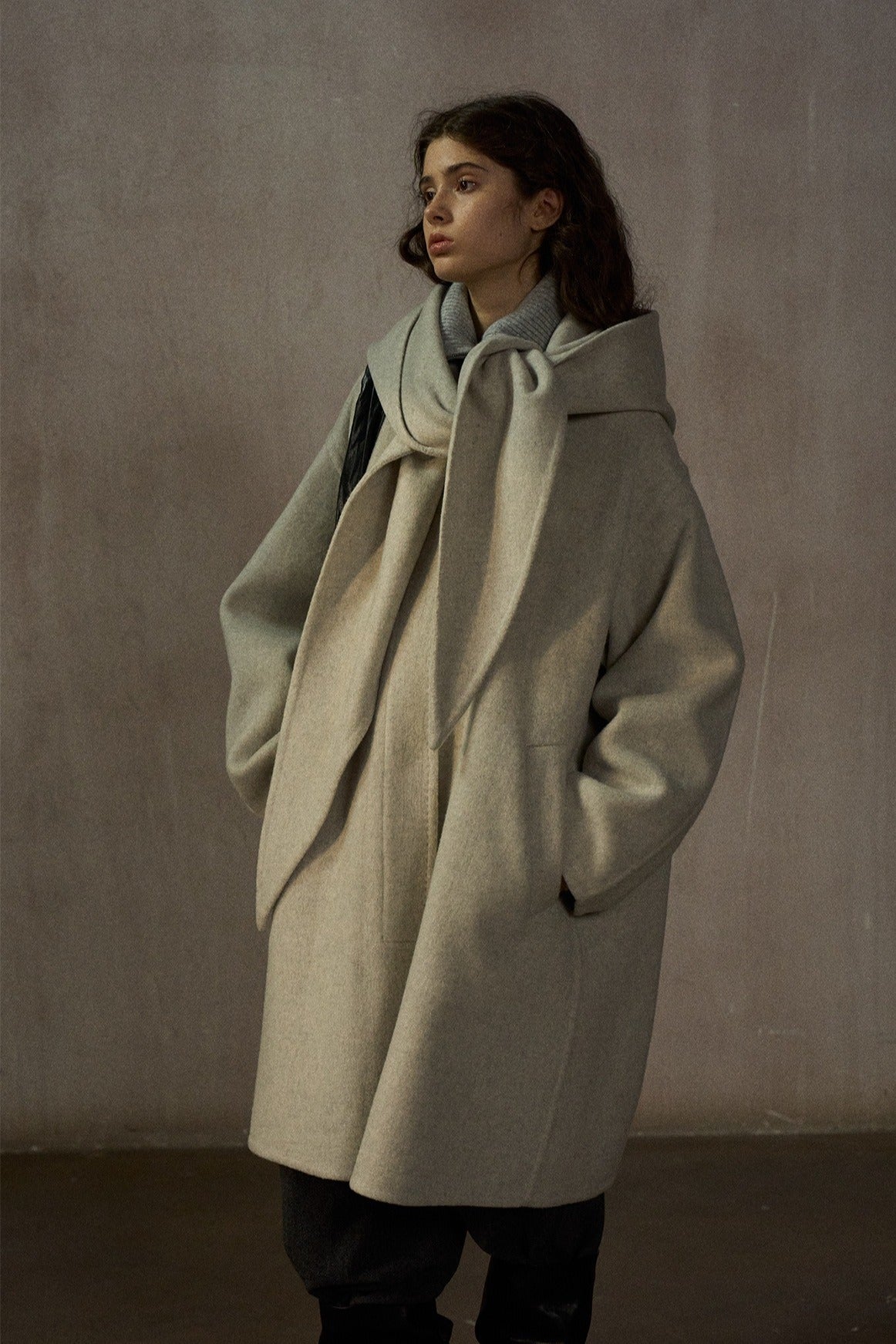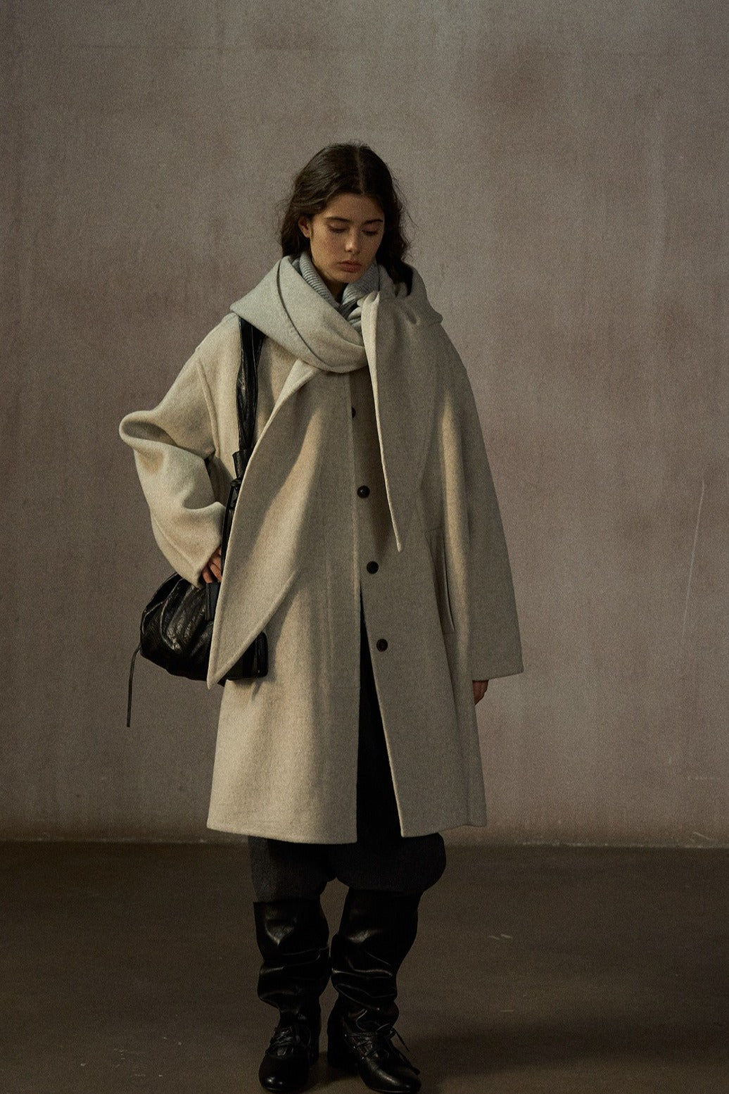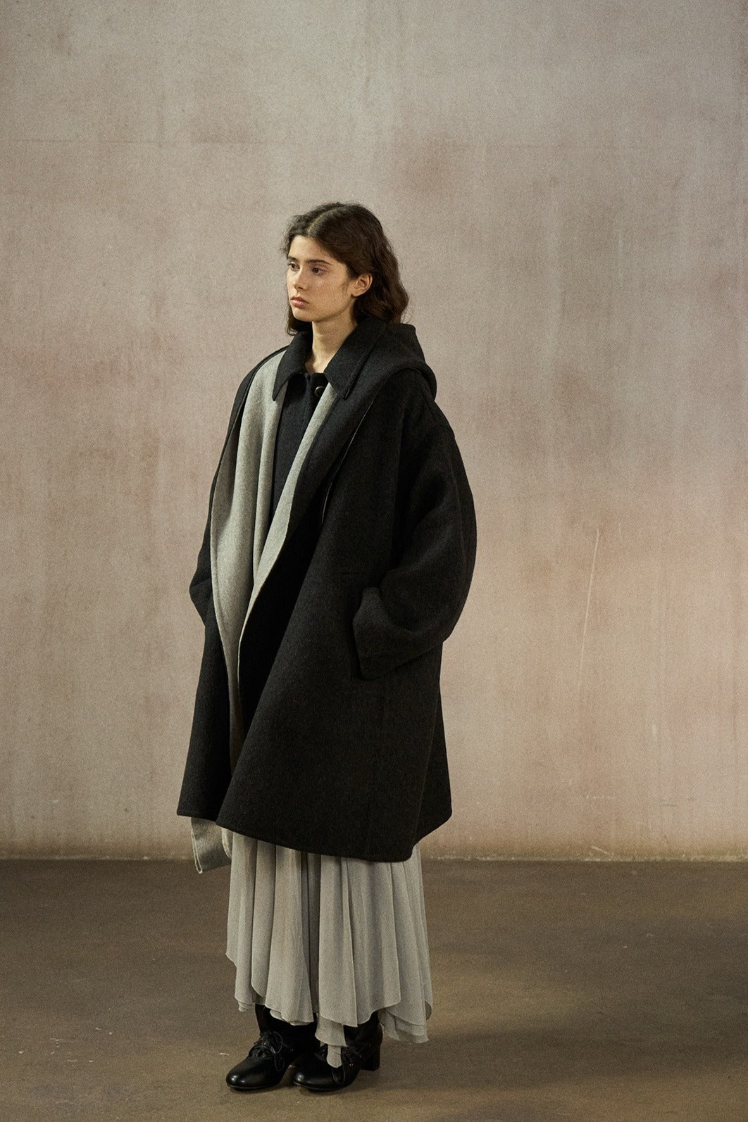 Manteau mi-long ample 100 % laine avec capuche foulard | 2 couleurs