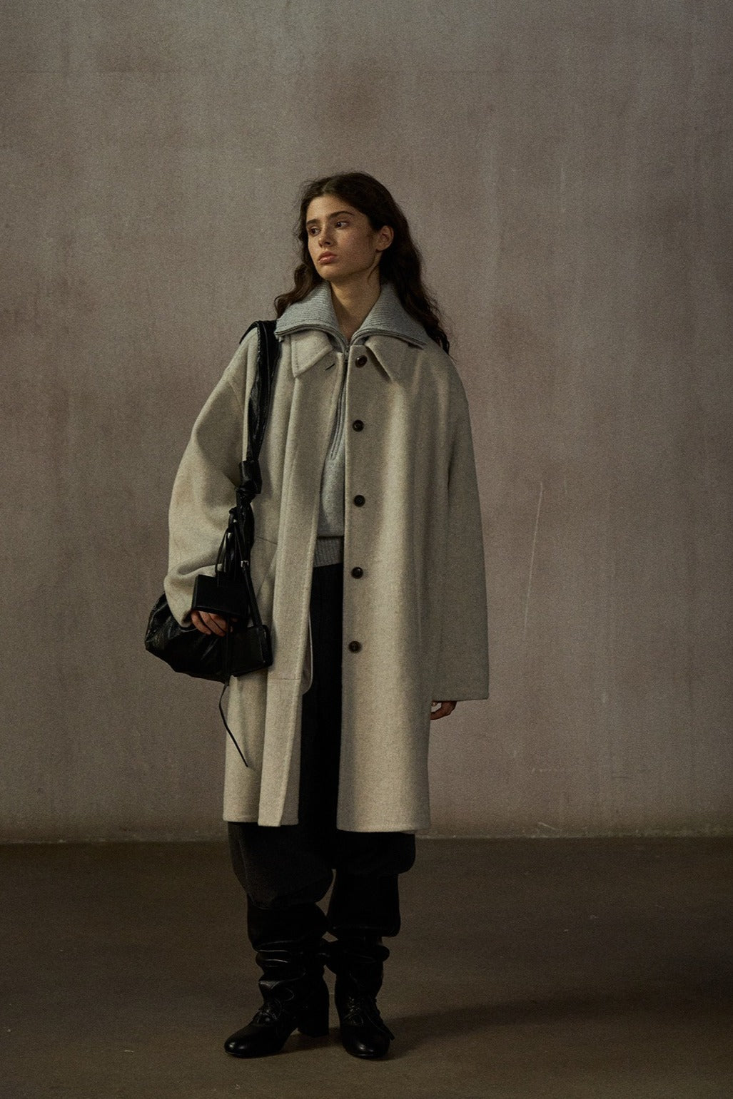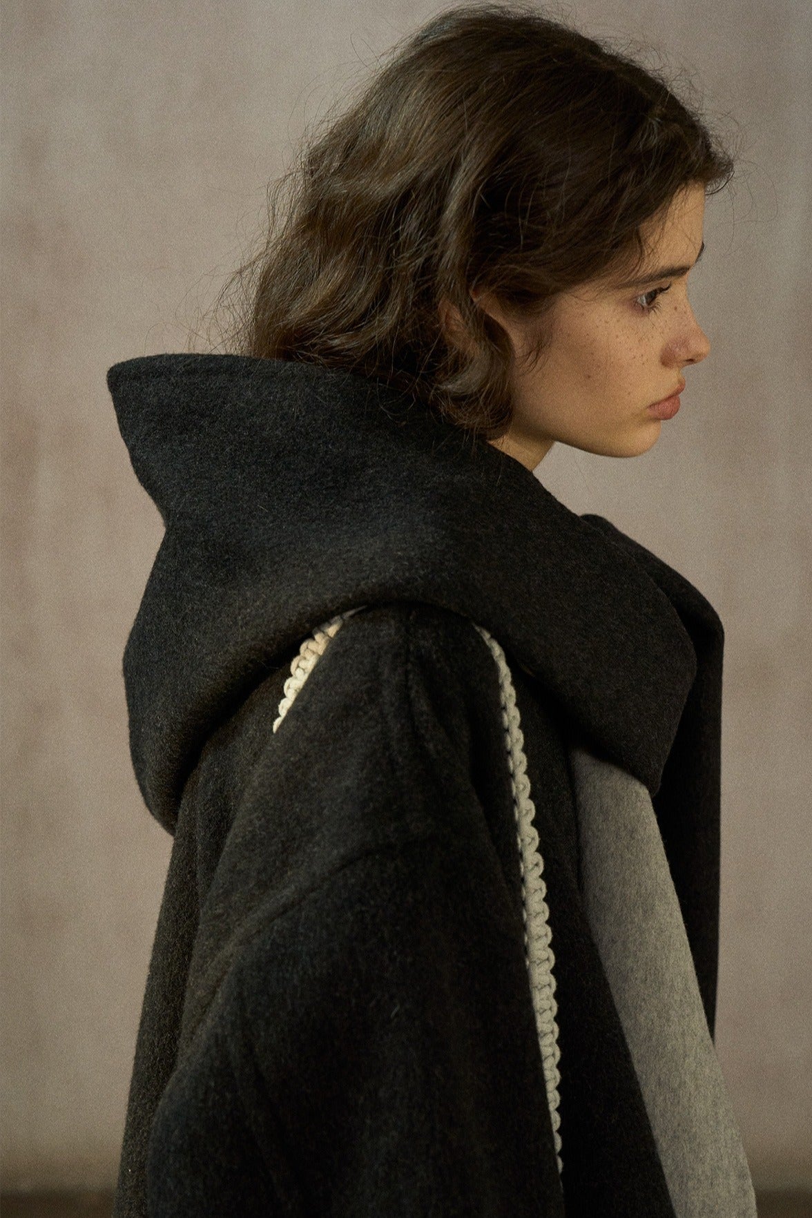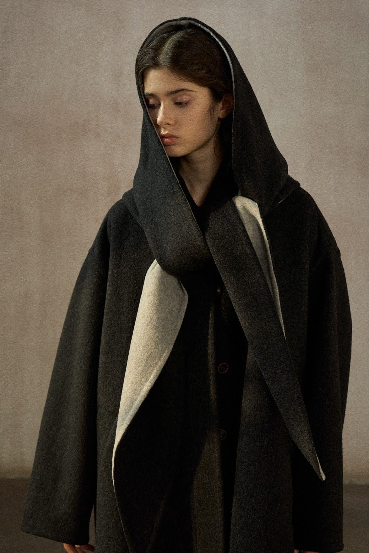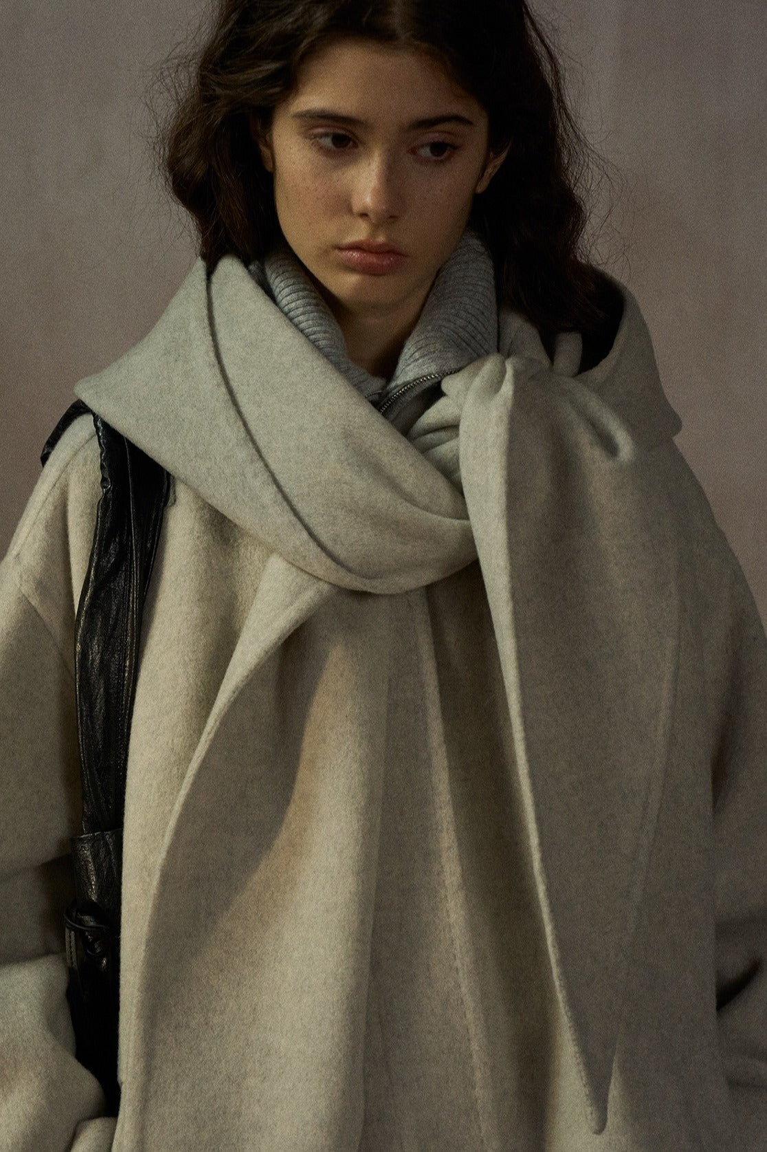 Manteau mi-long ample 100 % laine avec capuche foulard | 2 couleurs