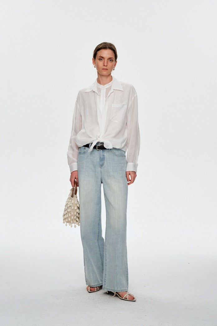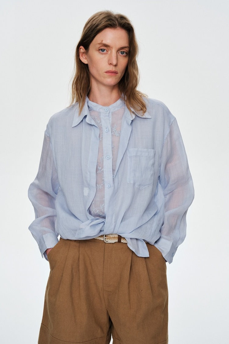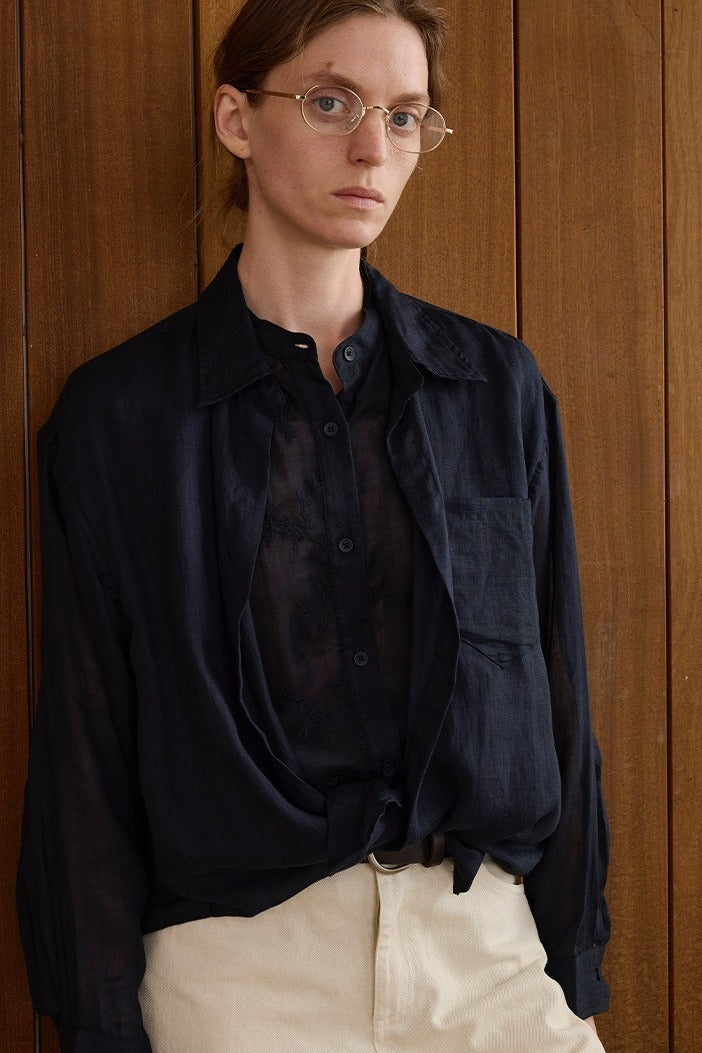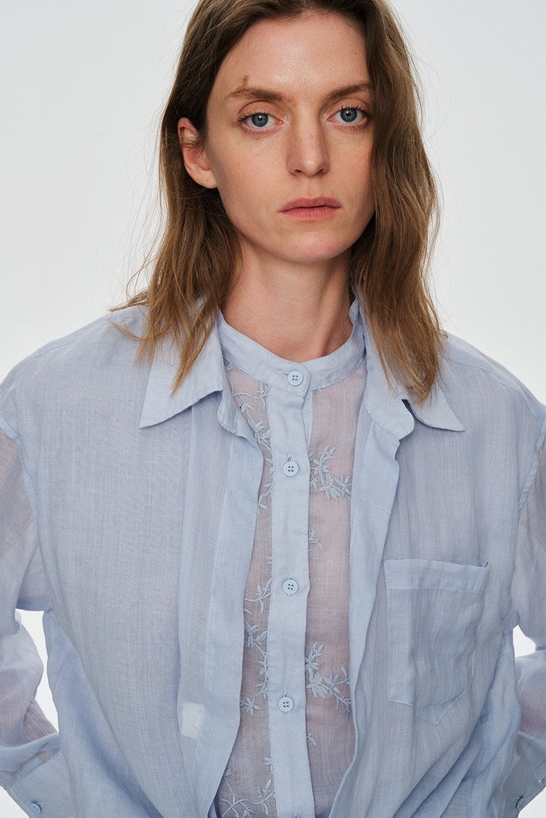 100% ramie faux-layer blouse with embroidered panels and long sleeves. Breathable, textured, artisanal—effortless elegance with handcrafted detail.