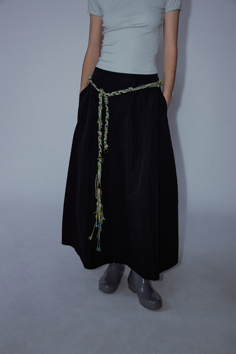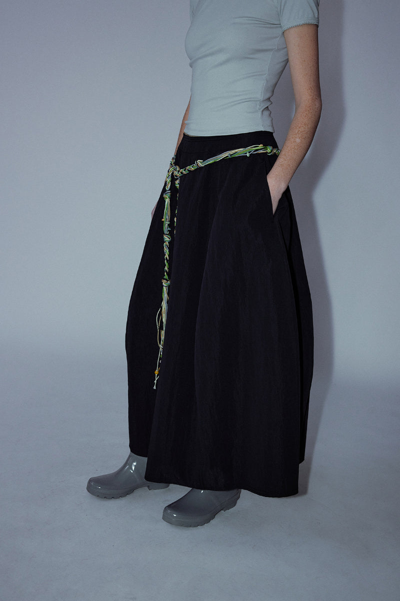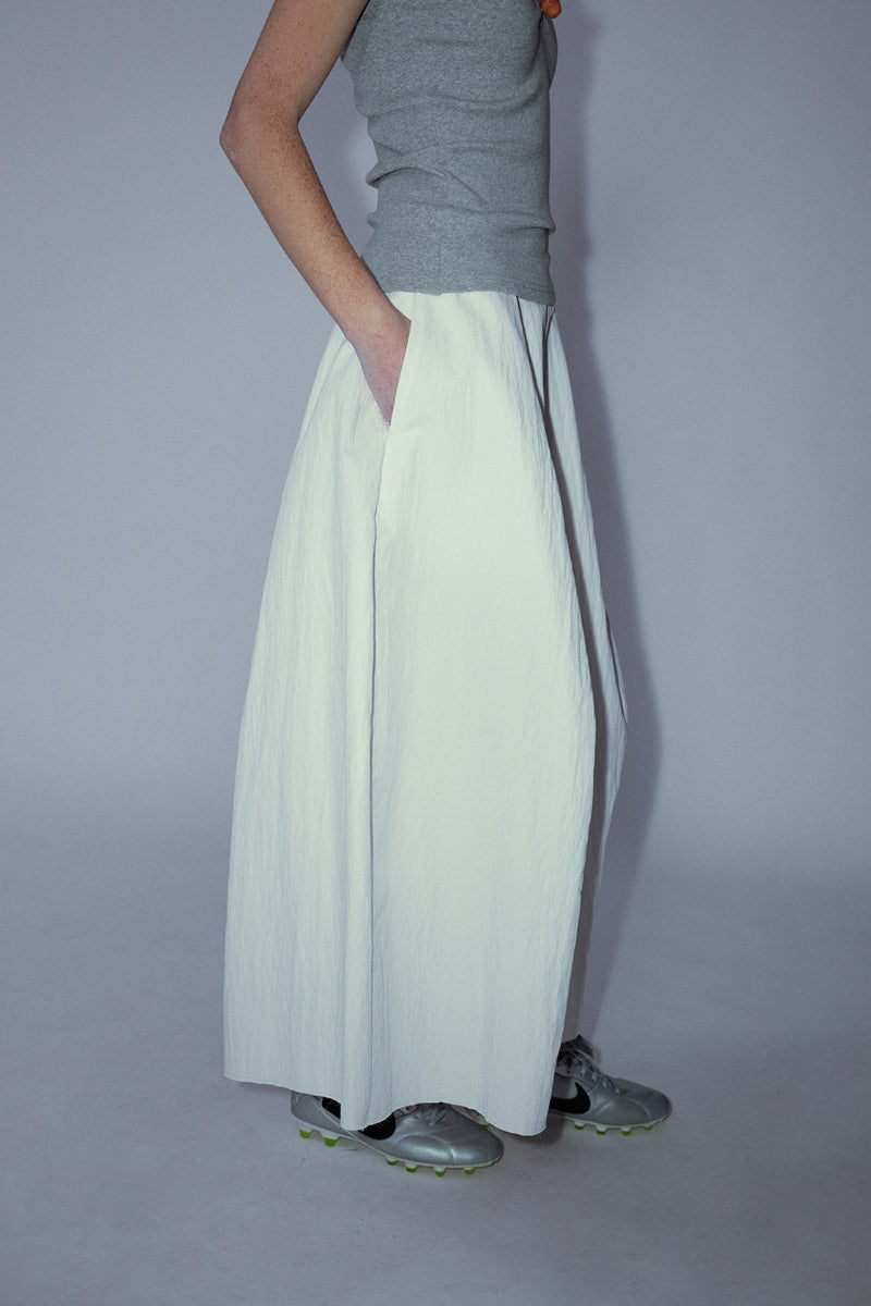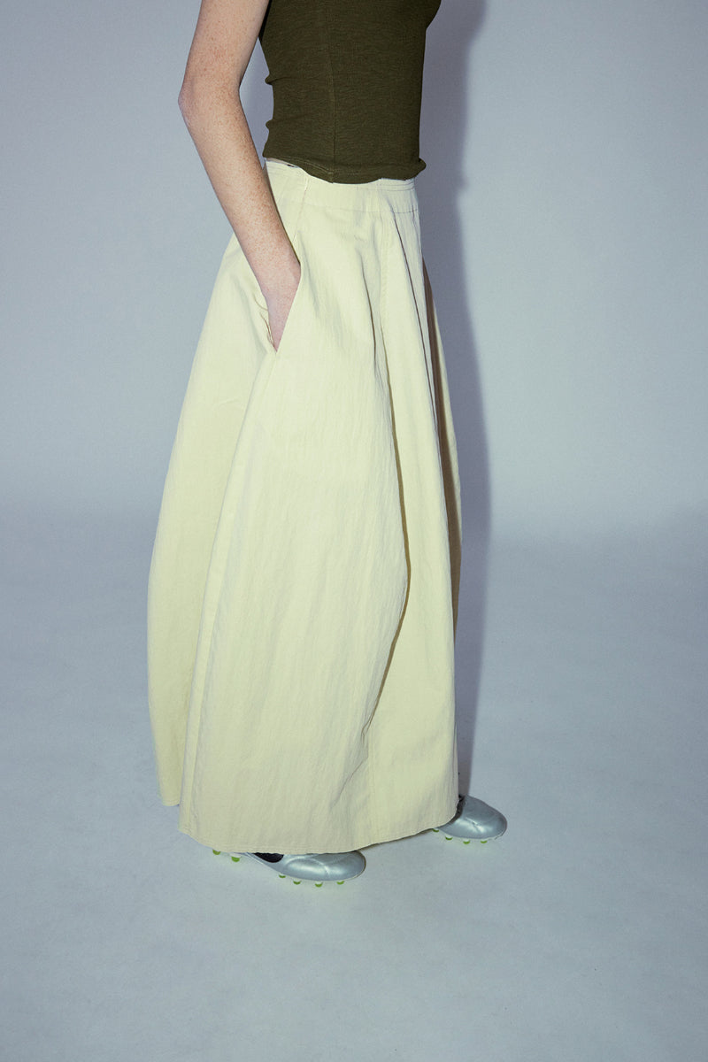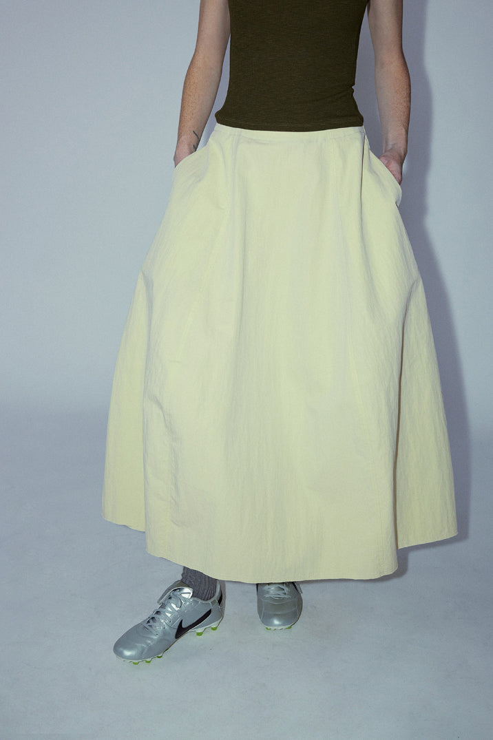 This A-line skirt is made from a cotton-blend fabric, featuring a pure color and a versatile design. The starfruit-inspired silhouette offers a relaxed fit with pockets for added functionality. Perfect for casual wear, this skirt is a basic yet essential piece that can be easily styled for any occasion.