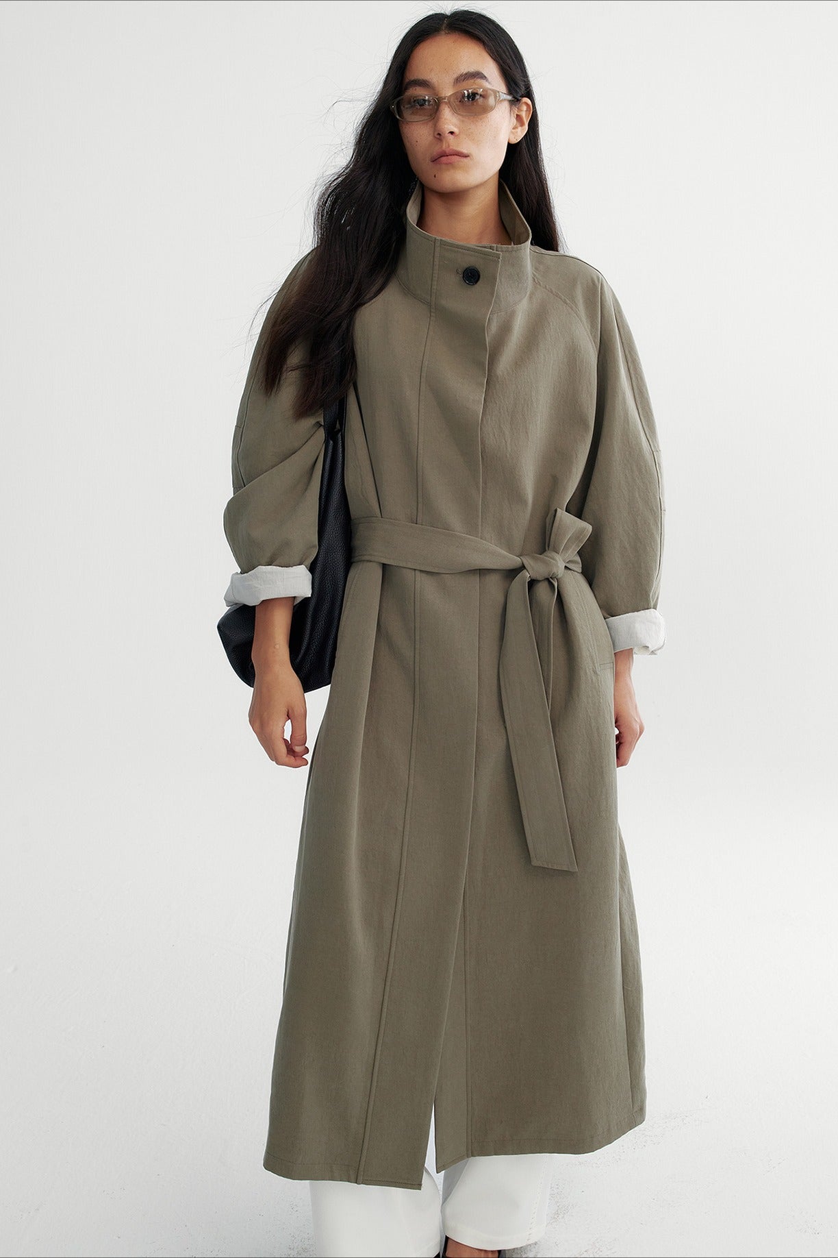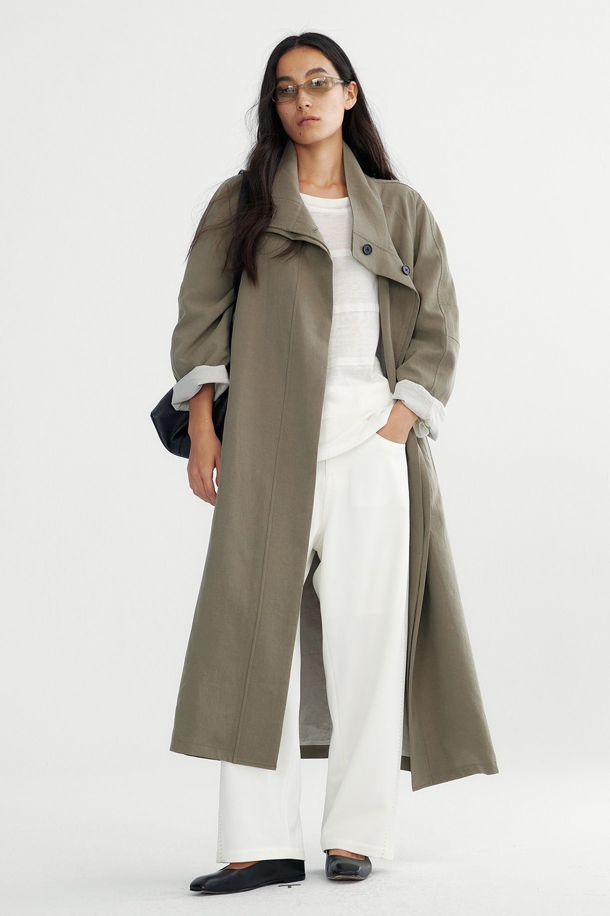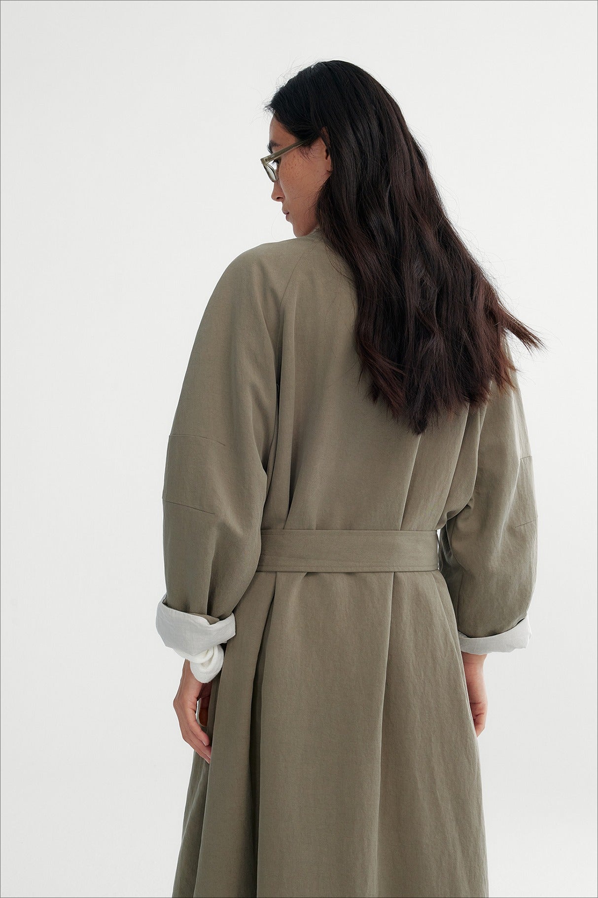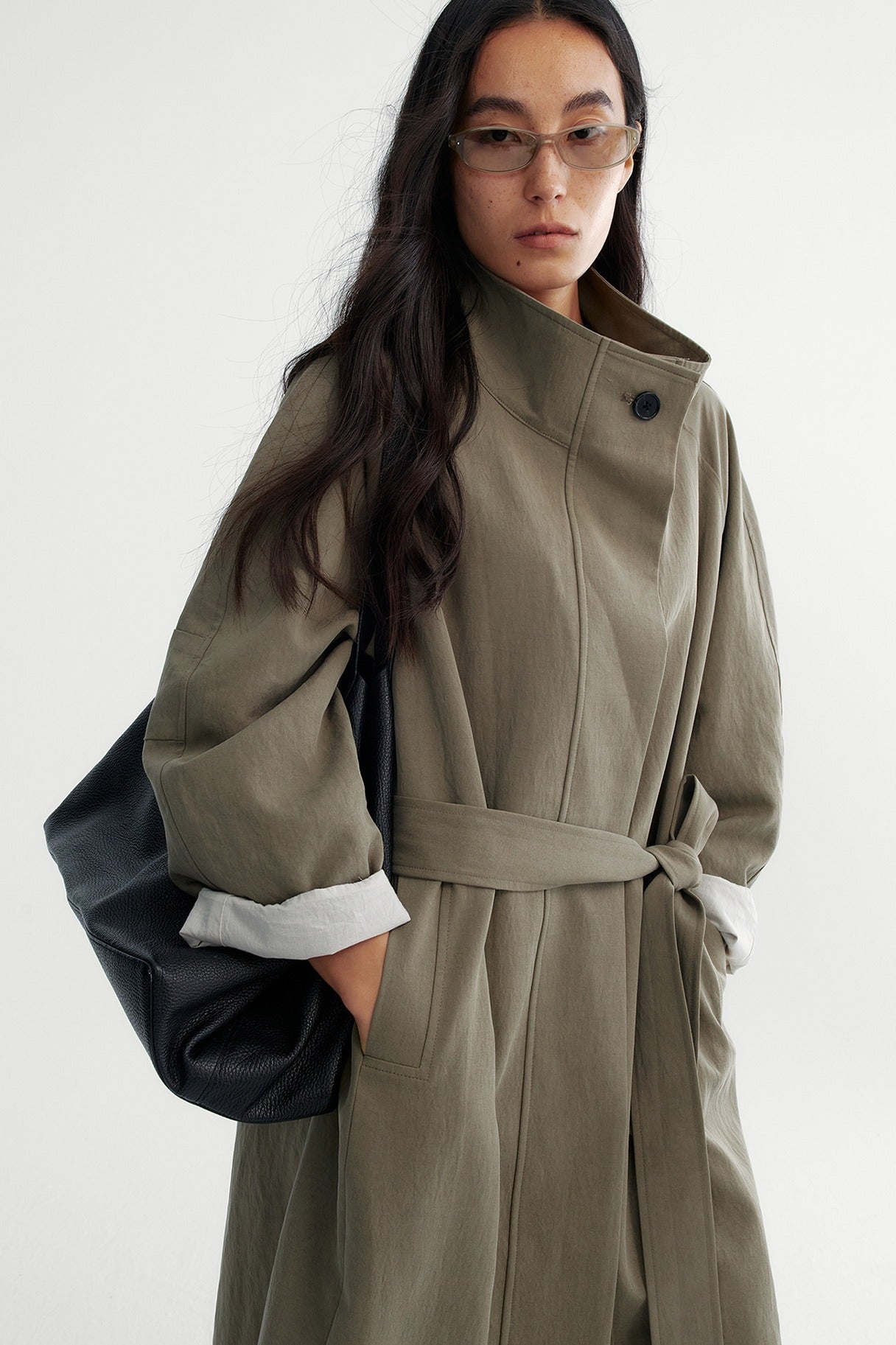 Cotton blend paper-like texture cocoon silhouette trench coat