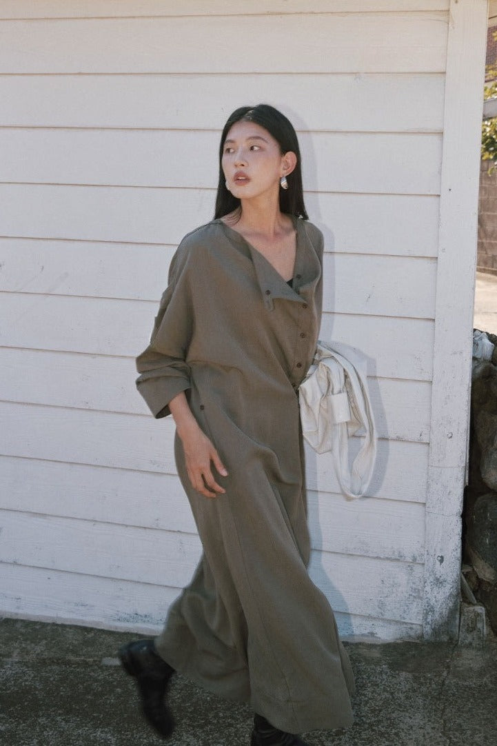Side-button placket blooms into a fluid maxi, self-tie waist sculpts clouds of drape. Matte lustre catches twilight—poetic, weightless romance for every spring&summer dusk.
