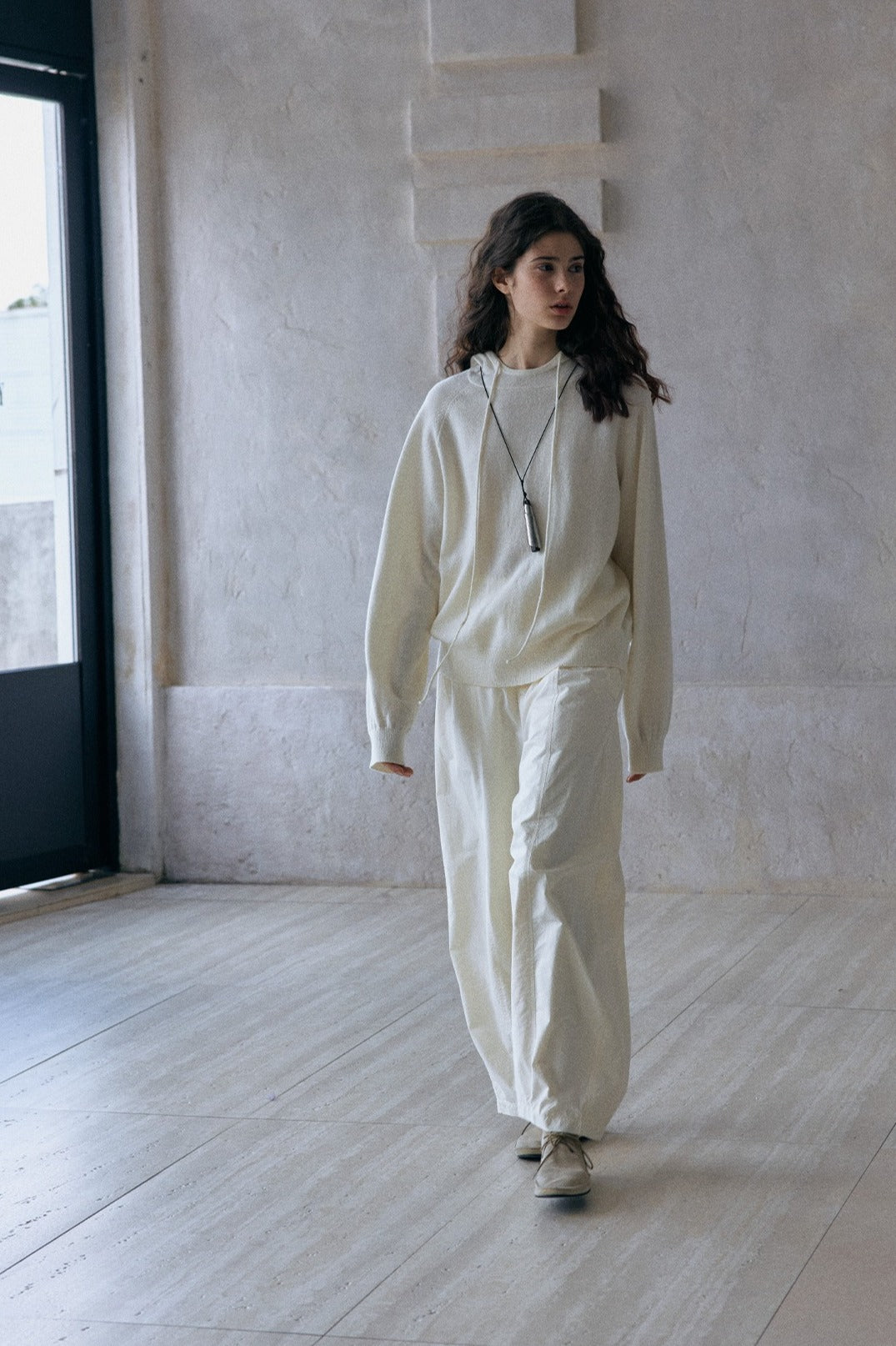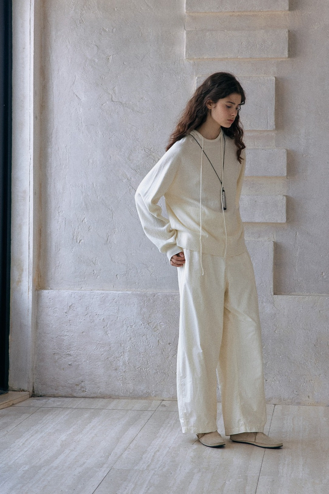 This washed cotton pants features soft, warm fleece inside. Minimalist and versatile, it’s ideal for casual or work.