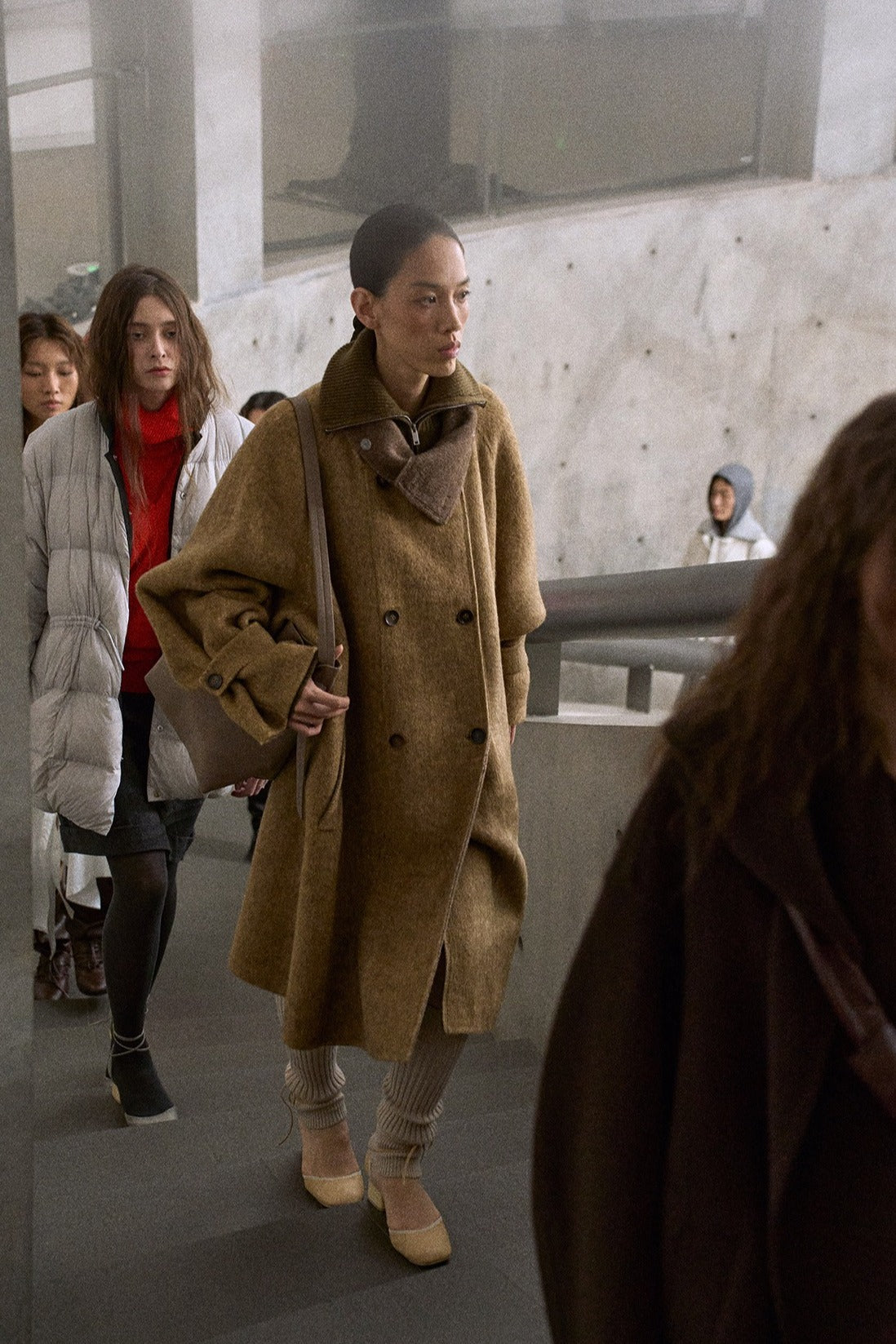 Crafted from a luxurious blend of wool, silk, and rabbit angora, this mid-length features a striking stand-up collar with large lapels, offering both elegance and warmth.